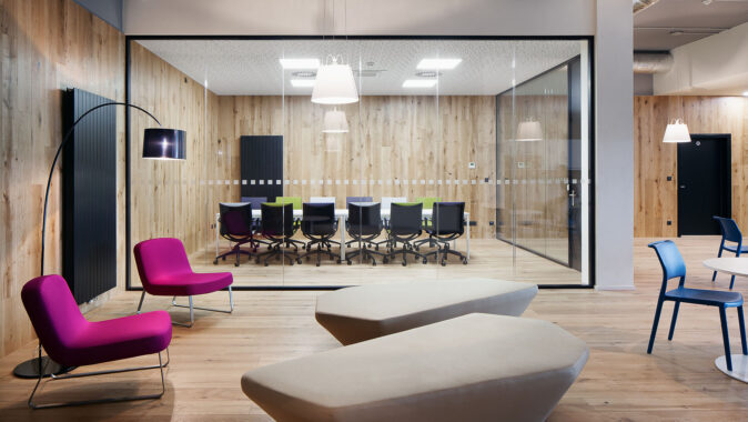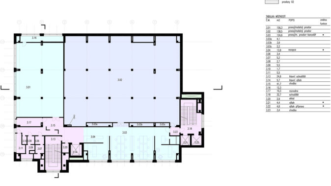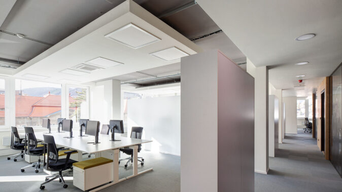 současný kancelářský prostor. Vnější plášť budovy byl proražen velkými okny,