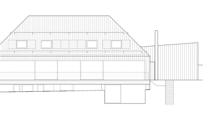 Jižní fasáda s panoramatickým oknem a terasami. Podzemní podlaží je zdola sotva viditelné, s výjimkou dřevěné paluby vyříznuté do svahu, která rozšiřuje spodní obytnou plochu směrem do krajiny.