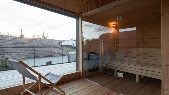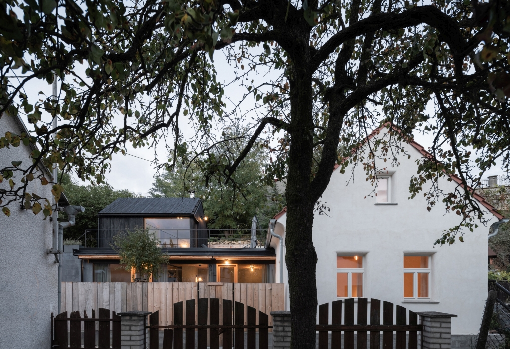Dům využívá do posledního kousku prudce se svažující pozemek. Na ploše 230 m2 se kromě domu samotného nachází i kůlna na kola a nad střešní terasou je do svahu zakousnutý bazén s panoramatickým výhledem do okolí.