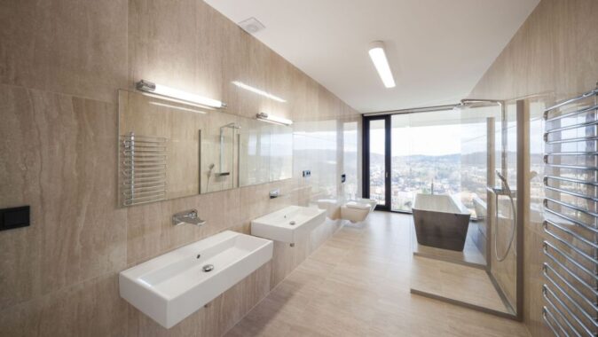 barvy, přičemž travertinový obklad krbu a koupelen pak tvoří doplňující