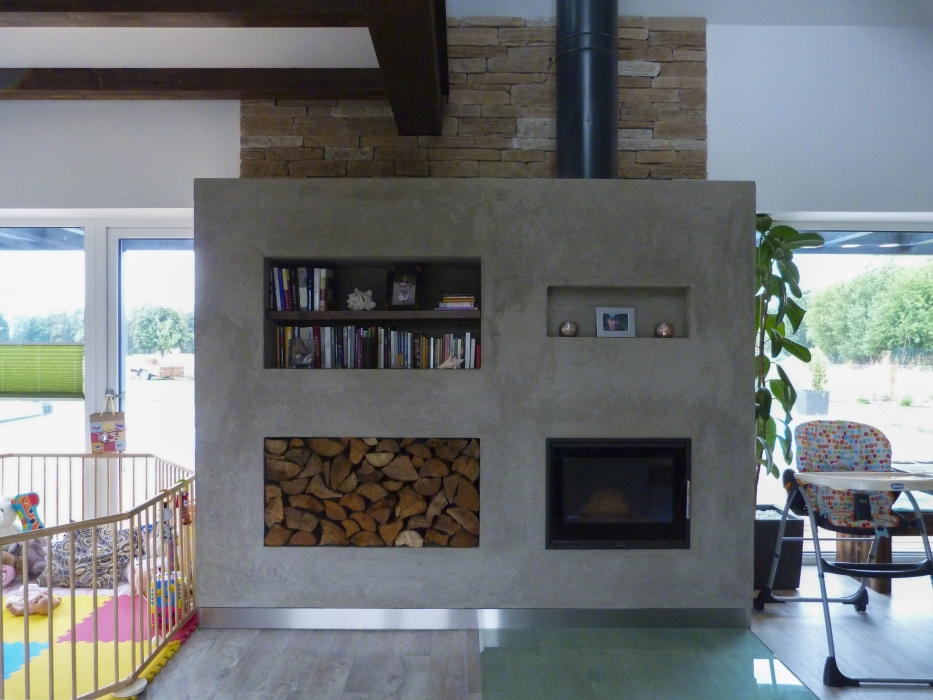 Dominantním prvkem v domě je krbová vložka na míru doplněná betonovou stěrkou. V zimním období je krbem možné vytopit celý obytný prostor.