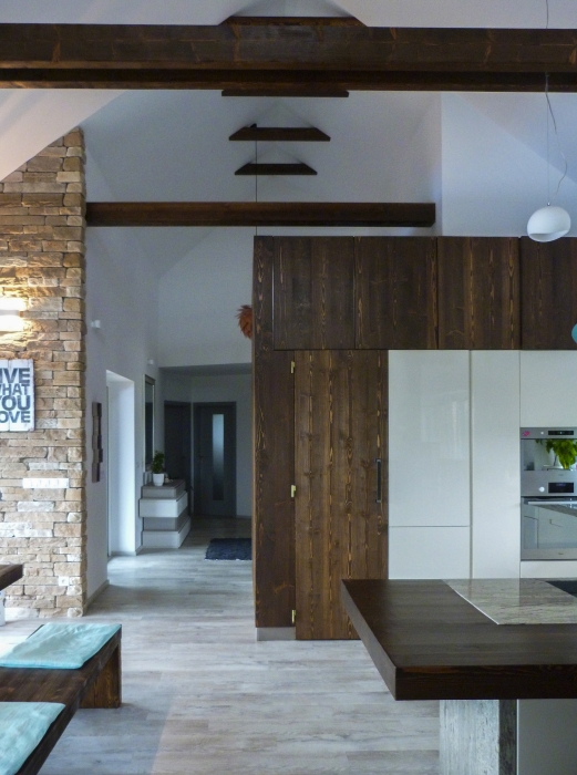 Kuchyň je vyrobená na míru od truhlářů. V celém interiéru se nám podařilo kombinovat přírodní masivní materiály a moderní lesklé povrchy. Dosahujeme tak vysokých kontrastů v celém interiéru, který si ale zachovává příjemnou zabydlenost.