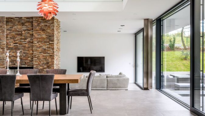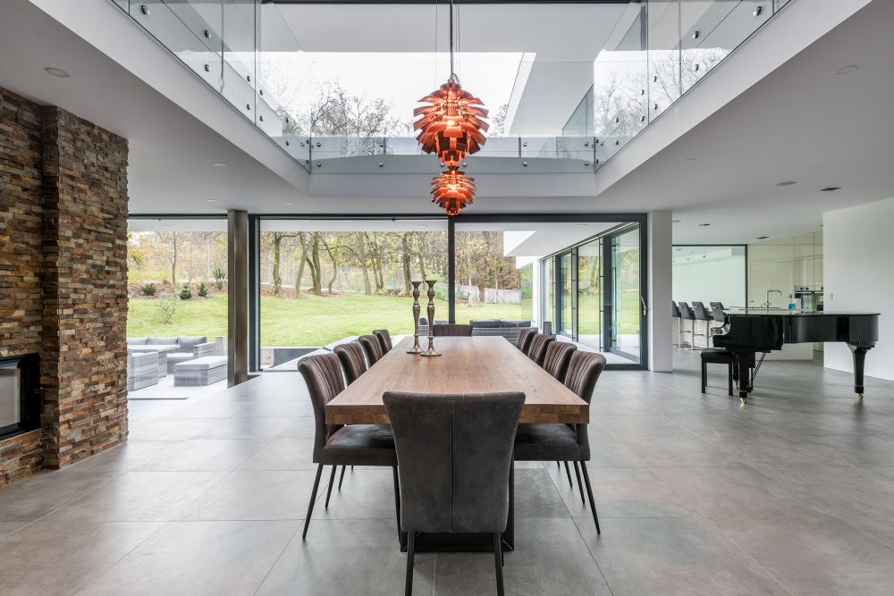 pásové okno. Do zahrady jsou orientované plně prosklené fasády na celou výšku