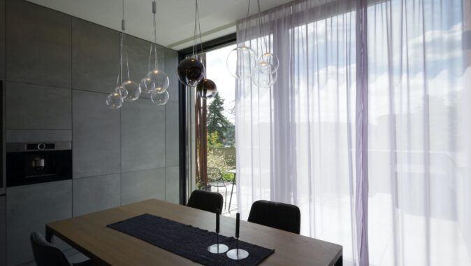 V úrovni zvýšeného přízemí je hlavní otevřený obytný prostor navazující na pobytovou terasu a zahradu, který je zároveň propojený s terasou nad garáží domu směrem do ulice. Tento nový prostor jídelny je tak propojen se zahradou a zároveň je v kontaktu s ulicí a sluncem.