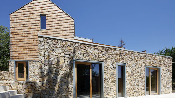Fasáda je z kamene a dřevěného šindele. Na obklad dřevěné fasády je