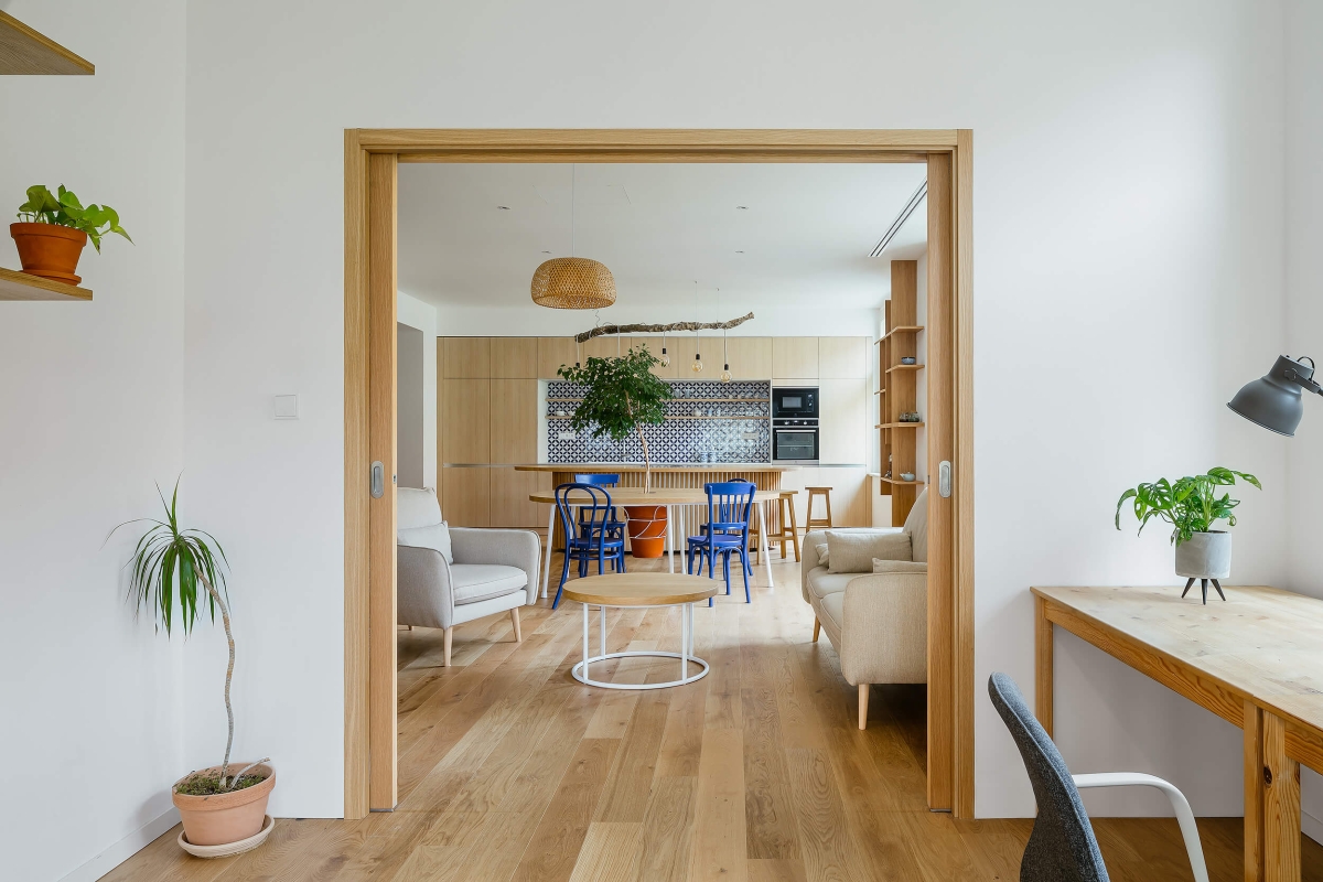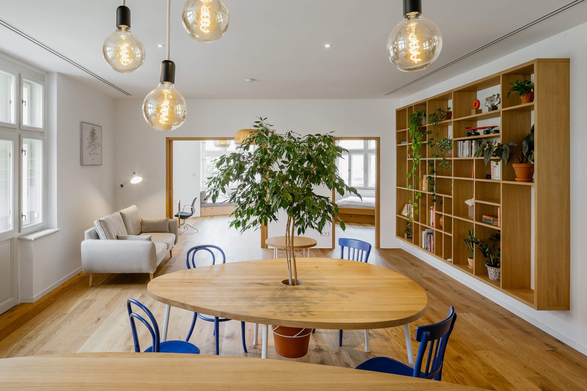 Centrem interiéru je hlavní obytná místnost o výměře 51 m2, která je koncipována jako maximálně otevřený prostor, v němž se prolínají provozy kuchyně, jídelny a obývacího pokoje. Přirozené křivky pohybu uživatelů tohoto prostoru byly inspirací k návrhu zaoblených prvků velkorysého kuchyňského ostrůvku, hlavního jídelního stolu a menšího stolku konferenčního. Triptych těchto elementů v prostoru akcentuje volnost pohybu a využívání této hlavní místnosti. Harmonický pocit v interiéru podtrhují také početné interiérové rostliny, které prakticky prorůstají celým bytem. Od knihoven a polic až po jídelní stůl, uprostřed nějž roste velký fíkovník.