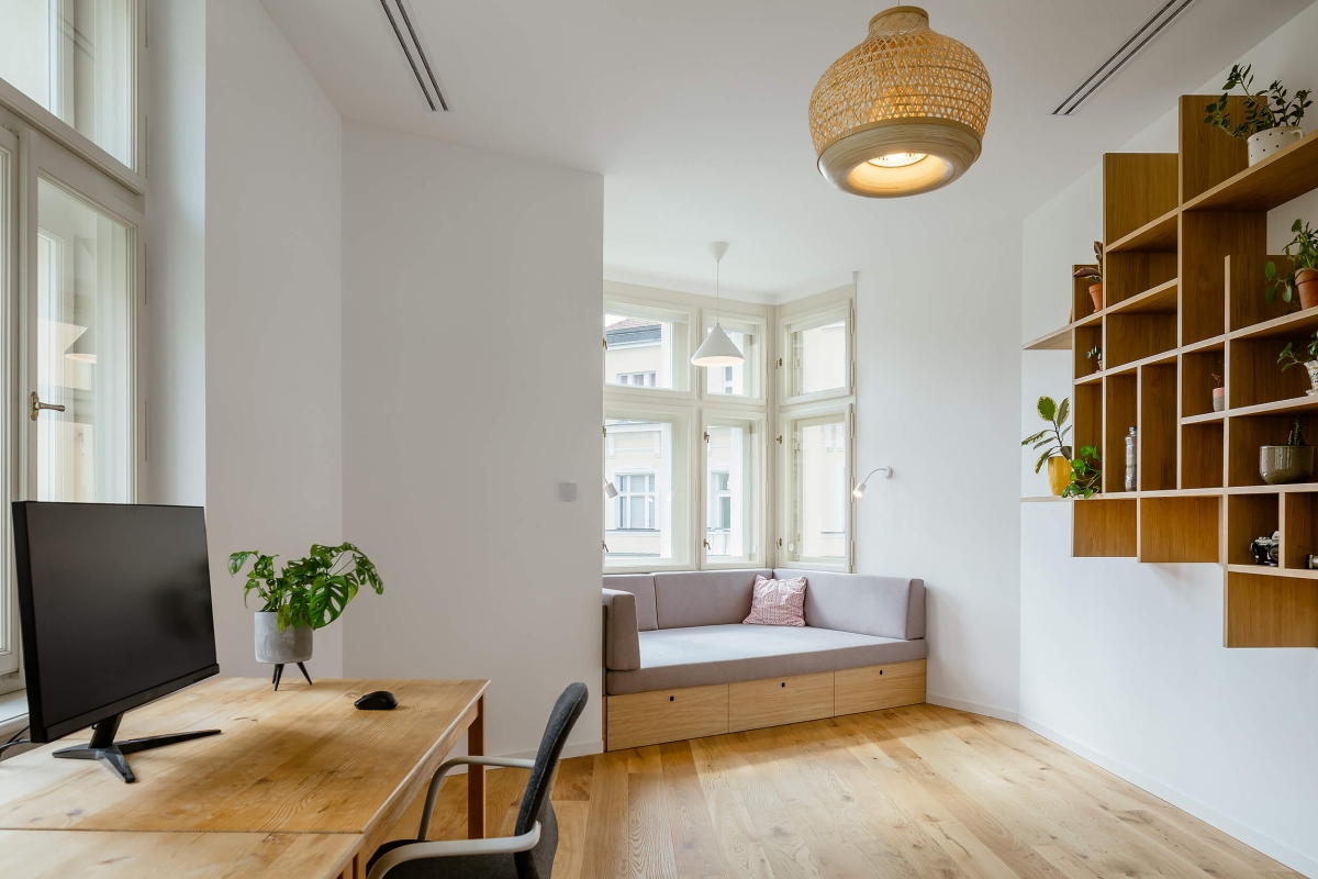 Na hlavní obytnou místnost navazují dva obytné pokoje. Ložnice, kde byla jedna stěna ponechána v původním stavu hrubé oškrábané omítky, která byla restaurátory pečlivě obnovena. A pokoj pracovny, který je od obývací části oddělen velkými dvoukřídlými posuvnými dveřmi. Tento pokoj se tak jednoduše může stát rozšířením hlavního obytného prostoru. Pracovna je připravena na adaptaci na funkci dětského pokoje a v prostoru fasádního arkýře je doplněna o vestavěnou pohovku, která slouží zároveň jako úložný prostor a návštěvnická postel.