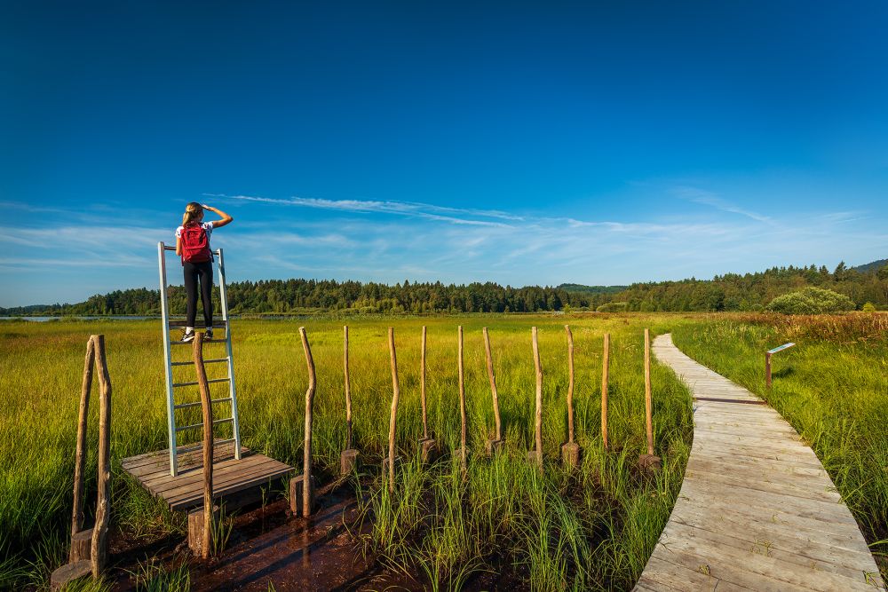 Z lesa vystupujeme k rybníku v místě, kde do něj ústí napájecí říčka Olšina. Z dálky jsou v ústí říčky vidět nashromážděné větve, snad bobří hráz? Ve skutečnosti je to lávka, která nás převede na druhou stranu říčky. Pěšina přechází v dřevěný chodník, ve kterém je občas chybějící prkno nahrazené naučným kovovým prvkem s přírodní tématikou, třeba s odlitky zvířecích stop. Pokračujeme k vyhlídce, kterou tvoří vyvýšený úsek chodníku. Po levé straně se rozprostírají rozlehlé pláně rašeliniště, po pravé straně zase klidná a temná hladina rybníka. Přítomnost vody všude kolem je cítit v každém kroku. Komu k rozhlédnutí se a nasátí okolní krajiny nestačí vyvýšený chodník, může si vylézt na kmen se strážním košem. K němu je ovšem třeba přeskákat mokřad po zaražených kůlech. My po úzké stoupající lávce lezeme do velké ptačí budky, kde odpočíváme a vyhlížíme na rybník z trochu jinak pojaté ptačí perspektivy.
