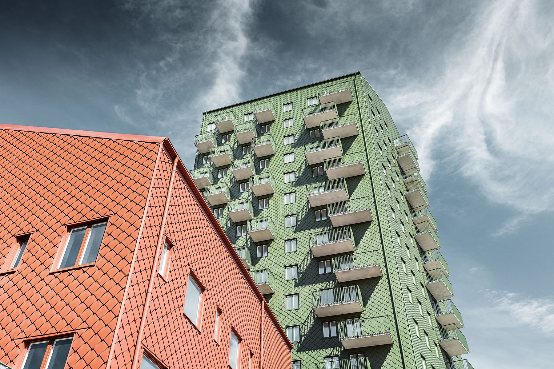 šedá je pomyslným mostem s okolní zástavbou Göteborgu a zelená