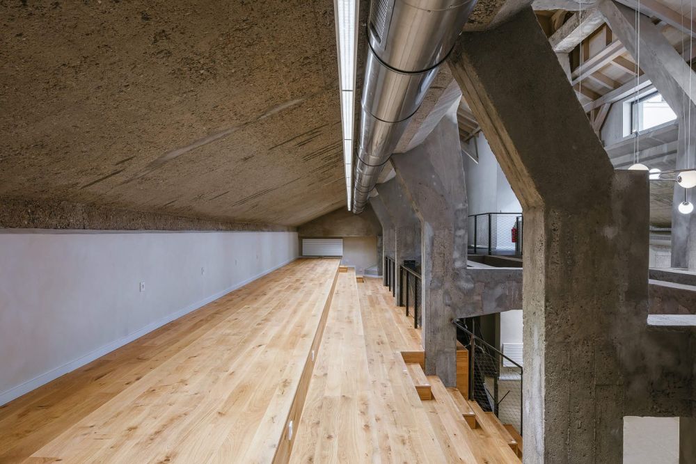 VŠCHT se na nás obrátila s myšlenkou využít novým způsobem dvorní objekt uhelny v jednom z vnitrobloků budovy A od Antonína Engela z roku 1936. Uhelna postavená jako jednoduchá průmyslová stavba sloužila pro zásobování sousední kotelny až do roku 1985, tedy krásných padesát let. Byla složená z dvojice sil se šikmým dnem, horní zásobovací chodbou a spodní odebírací chodbou, odkud se uhlí v kovových vozících na kolejnicích vozilo ke kotlům. Střední věž nad chodbou nesla cisternu s vodou pro provoz kotelny. Po roce 1985 se objekt nevyužíval, sloužil trochu jako sklad a trochu jako hřbitov nepotřebných věcí. Když nás do něj poprvé přivedl investor, nezdálo se, že by se prostor dal smysluplně využít. Chyběly rovné části podlah a větší prostor. Pohled do řezu s dvěma naklopenými plochami nás přivedl na myšlenku využít jednu stranu jako skloněné auditorium. Rozhodli jsme se zachovat maximum z betonové konstrukce, která je krásná ve své původní účelovosti. Cílem bylo také získat jeden souvislý prostor, který bude sloužit přednáškám, setkáním, neformální práci. Jedna z výsypek byla proto odstraněna, na druhé jsou byly dřevěné stupně sloužící jako hlediště. Vložené schodiště, jako nový objekt v prostoru, propojuje obě výškové úrovně. Betonová konstrukce byla očištěna, ošetřena a vyspravena pouze lokálně v nezbytně nutném rozsahu. Konstrukce nového schodiště je ocelová s přiznaným přírodním černým vzhledem. Povrch stupňovitého hlediště tvoří dubová podlahová prkna.