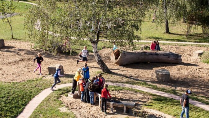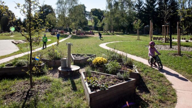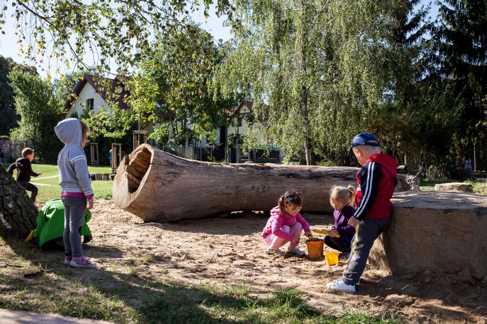 lokálními biotopy a živly a propojuje původně roztříštěnou zahradu a vede děti