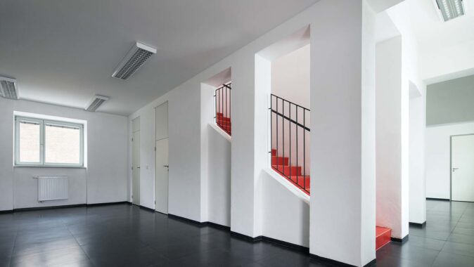 s výhledem do prostoru před školou. Nepravidelně rozmístěná okna ve