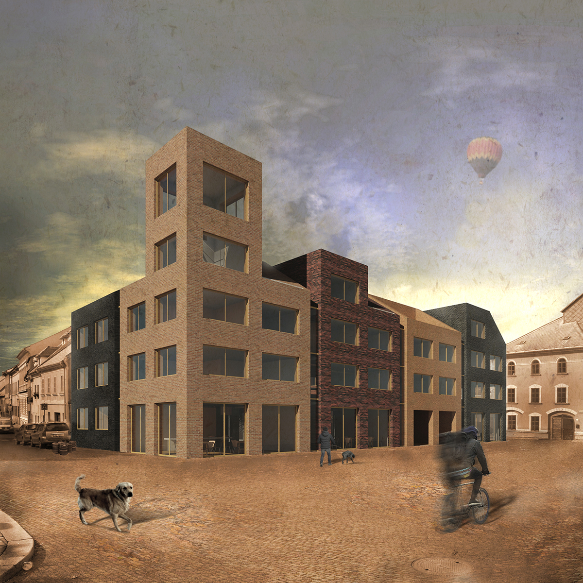 V návrhu bytového domu pro Žatec jsem se pokusil vhodně zasáhnout do kontextu Pražského předměstí, bývalé průmyslové čtvrti. Mělkou dispozici návrhu definovalo rozhodnutí plně využít vnitrobloku. Budova reaguje na měřítko okolních domů a je rozdělena na osm menších hmot, v každé se nachází jeden vertikální mezonetový byt. K jejich lepšímu odlišení a navození pocitu vlastního domova mají různě barevné cihlové fasády.