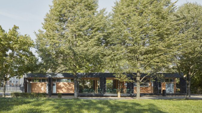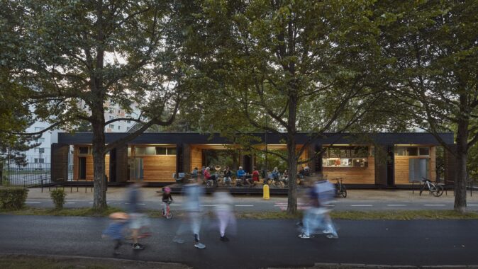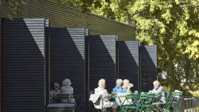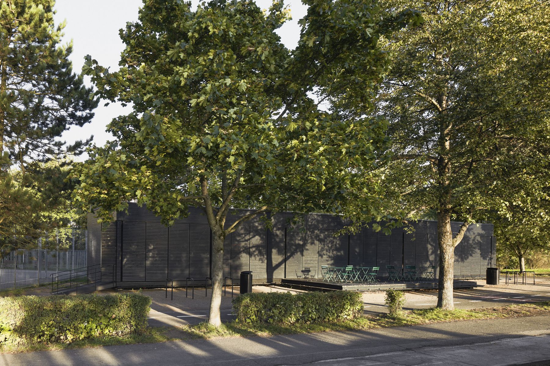 At the „jablonec sea“, the current situation without proper facilities became unbearable and the town decided to launch a competition for facilities for three different locations in 2020. ‚U Prutu‘ (= by the fishing rod) is clearly the most urban one, due to the nearby housing estate, the playground, the promenade, the cycle path and the beach. This facility is the first one built of the proposed. The kiosk floats in the new clay area, making use of the multiple directions of access and the existing trees that have thus become part of the whole. It will be the only one of the proposed facilities to operate all year round. The facility is divided by thirds into a kiosk, covered seating and a public toilets.