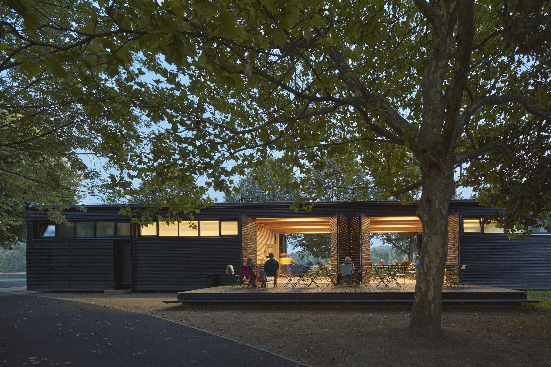 As a whole, the kiosk can be completely closed by a folding door, which is located on the outer line of the porch. This covered corridor not only links the internal functions into one whole, but unifies all the proposed buildings around the dam. The black façade paint sets itself neutrally to the facades of the block of flats behind and reinforces the duality of interior/exterior.