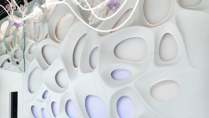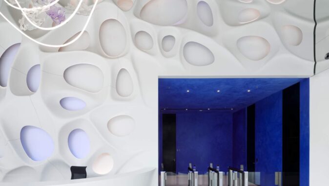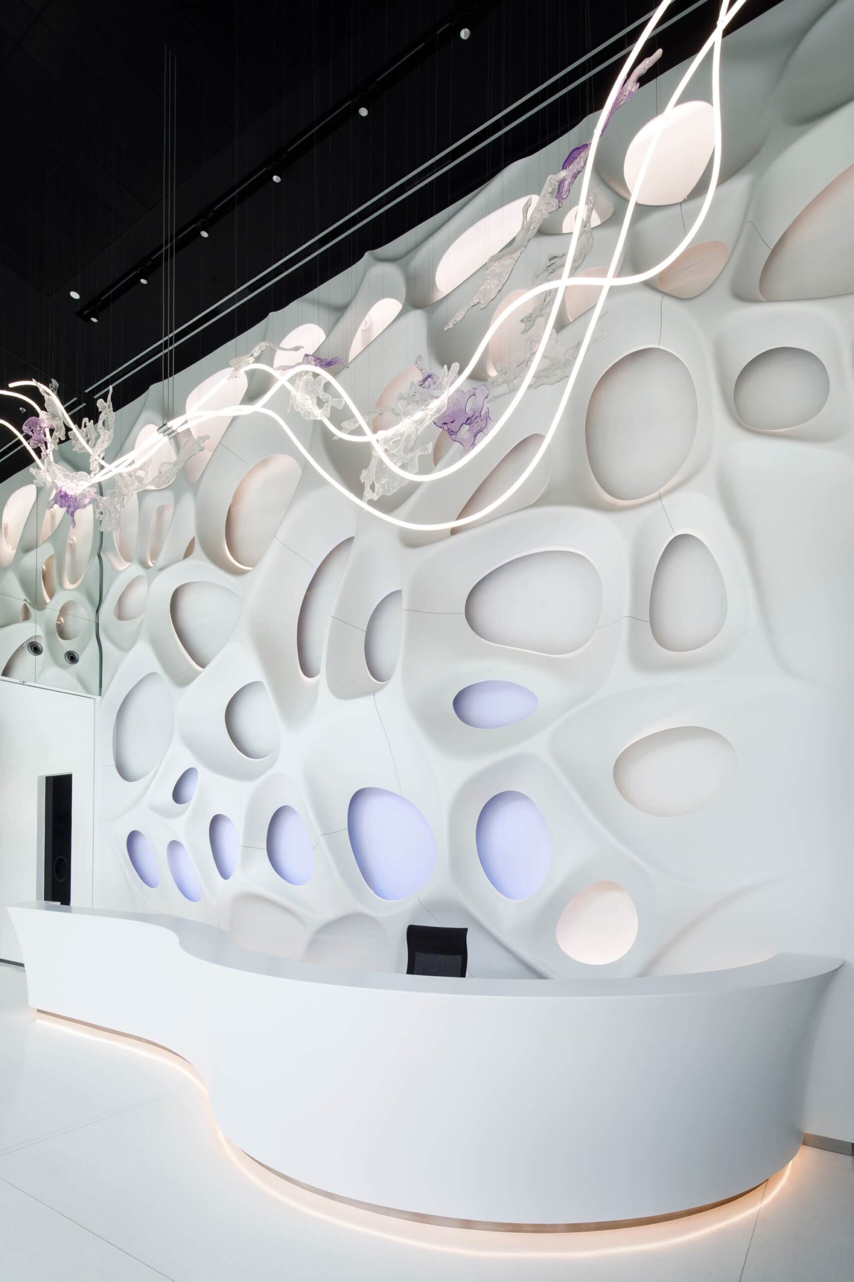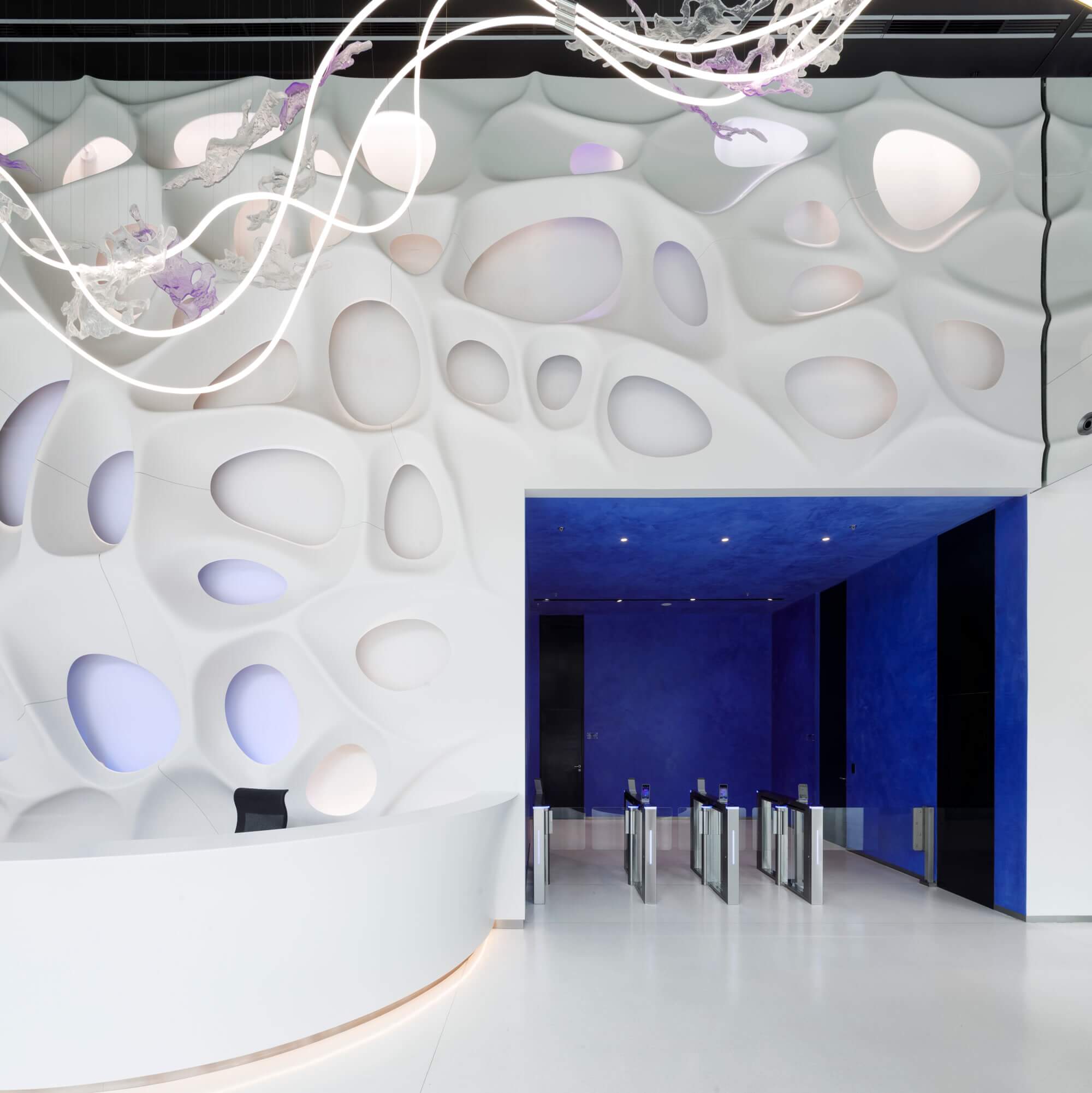 Záměrem architektky Evy Jiřičné a jejího kolegy architekta Petra Vágnera z ateliéru bylo vytvořit originální a transparentní objekt, což umožňuje celoskleněná fasáda. Rukopis Evy Jiřičné je vepsán i do vstupního lobby, kde na první pohled zaujme bionická podsvětlená stěna z Corianu, navazující na monumentální recepční pult. Moderní plastiky vyrobilo brněnské studio A.M.O.S. DESIGN dle návrhu architekty Evy Jiřičné. Ta do modelování stěny zapojila i umělou inteligenci. Profilovanou stěnu doplňuje skleněná svítící plastika od sklářské společnosti Lasvit. I tento objekt navrhla Eva Jiřičná. Všechny tři prvky (bionická stěna, recepční pult a plastika) jsou inspirovány vodou jako základem života (bubliny ve stěně, vlna recepčního pultu, prýštící voda v lustru) a navazují tak na slunolamy ve tvaru vln na jižní fasádě Arché.