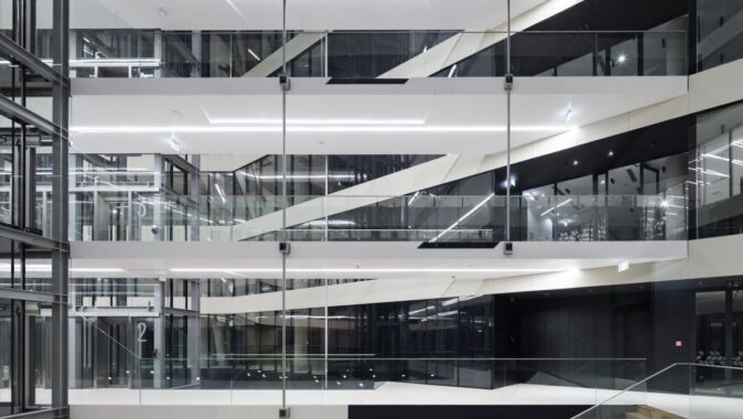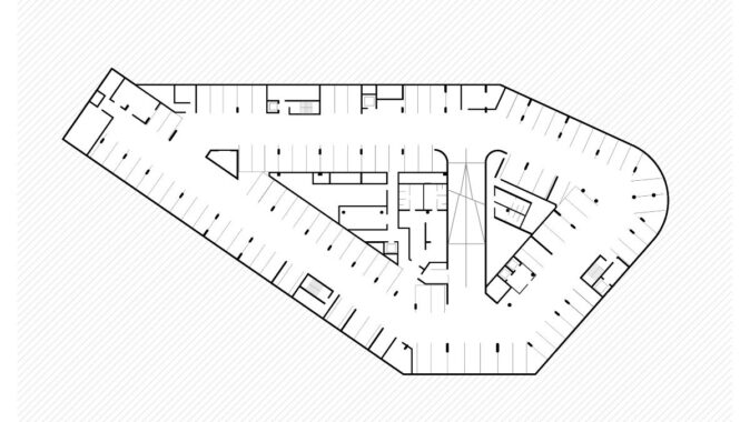 Přímé linie jsou nástrojem integrace do tvaru pozemku, dopravního skeletu a budoucí blokové struktury. Oblé tvary jsou potom prostředkem adaptace kancelářské budovy na přírodní prostředí. Výsledkem je kompaktní hmota s vnitřní prosklenou dvoranou, v jejímž těžišti je výtahová věž obsluhující pomocí lávek kancelářské prostory ve všech podlažích. Přízemí dvorany je polo-veřejným prostorem. Vedle lobby, interiérové zahrady a relaxačních prostor je zde i prostor pro pořádání kulturních akcí pro veřejnost.