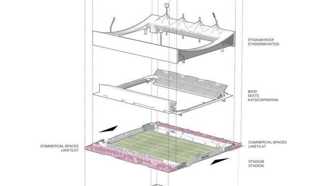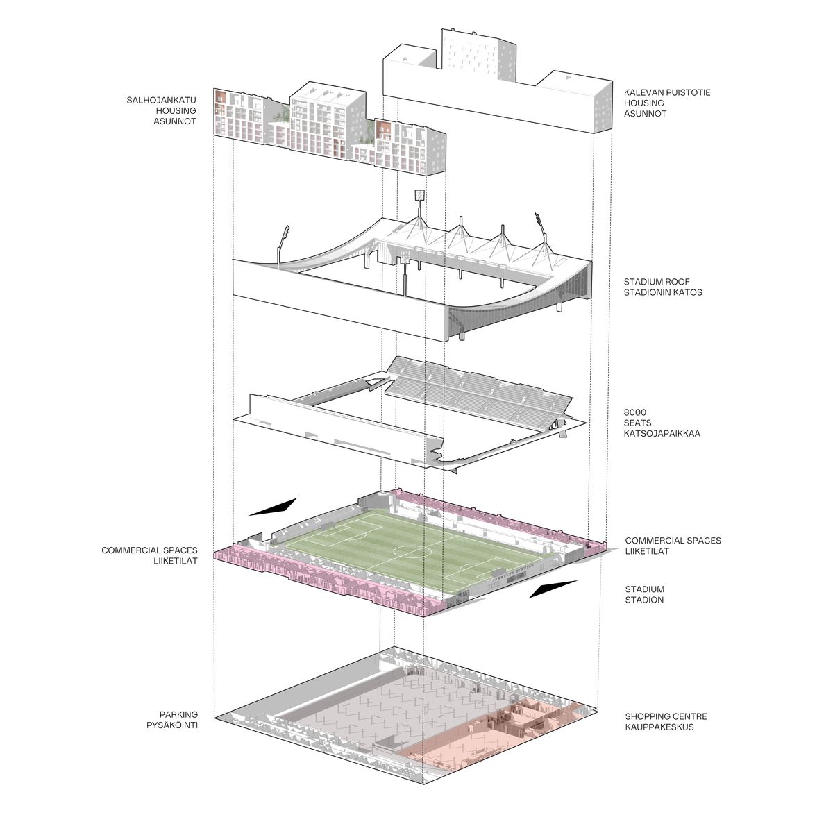 Zásadním tématem návrhu bylo vložení stadionu do husté obytné struktury při zachování běžného provozu města. Soutěžní návrh Hattutemppu („hattrick“) vrství sport, bydlení a obchodní funkce do jednoho celku. Stadion má kapacitu 8 000 míst k sezení s možností navýšení až na 15 000 návštěvníků při kulturních a společenských akcích; všechna sedadla mají přímý výhled na hřiště. Vstupy na stadion jsou situovány v rozích bloku, zatímco vstupy do obytných domů jsou orientovány do ulic. Prostorové a akustické řešení umožňuje souběžné fungování bydlení a intenzivního provozu stadionu (přibližně 100 sportovních utkání a až 300 akcí ročně).