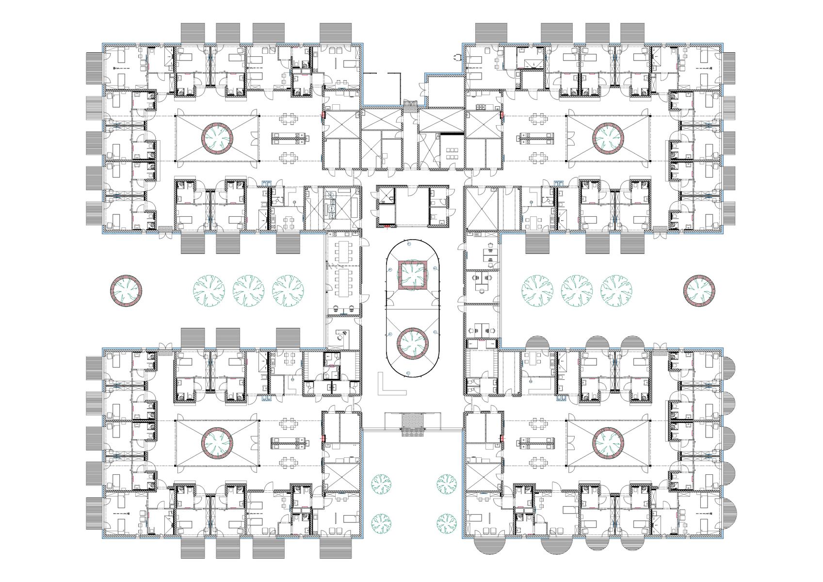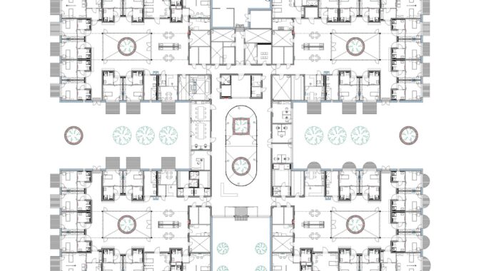 Provoz zařízení pro přibližně šedesát klientů je založen na principu menších komunit. Každá domácnost funguje samostatně a disponuje vlastním zázemím pro obyvatele i personál. Dispozice minimalizuje vznik dlouhých chodeb — pokoje jsou uspořádány kolem vnitřních atrií, která přivádějí denní světlo hluboko do dispozice a zároveň slouží jako orientační i společenský prostor.