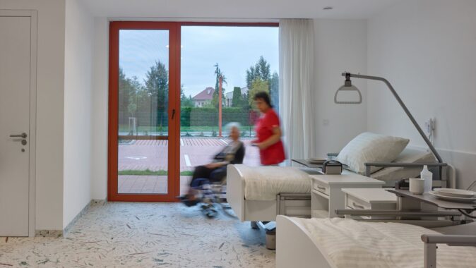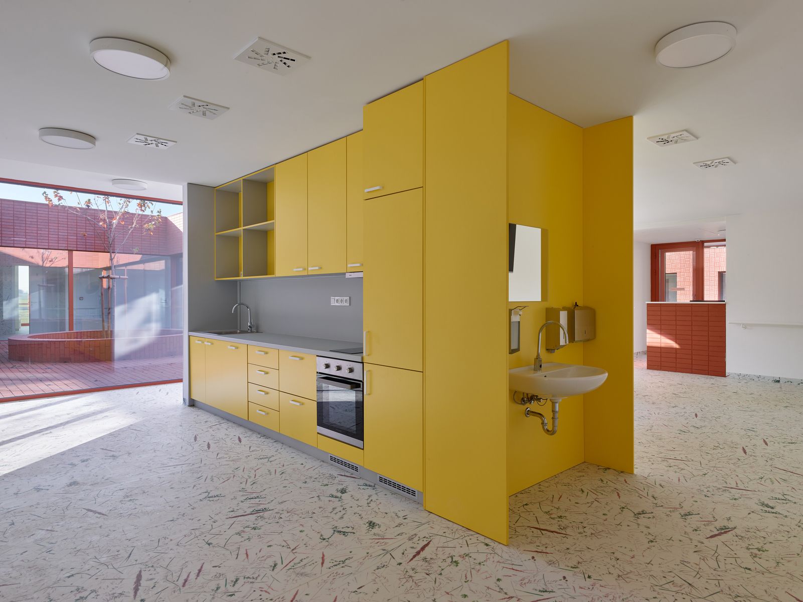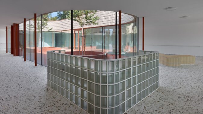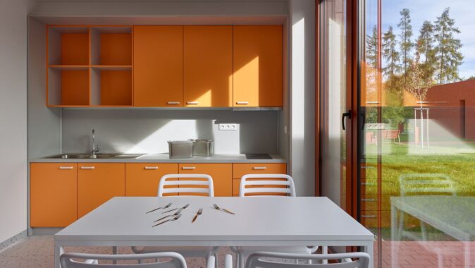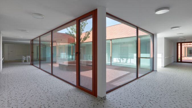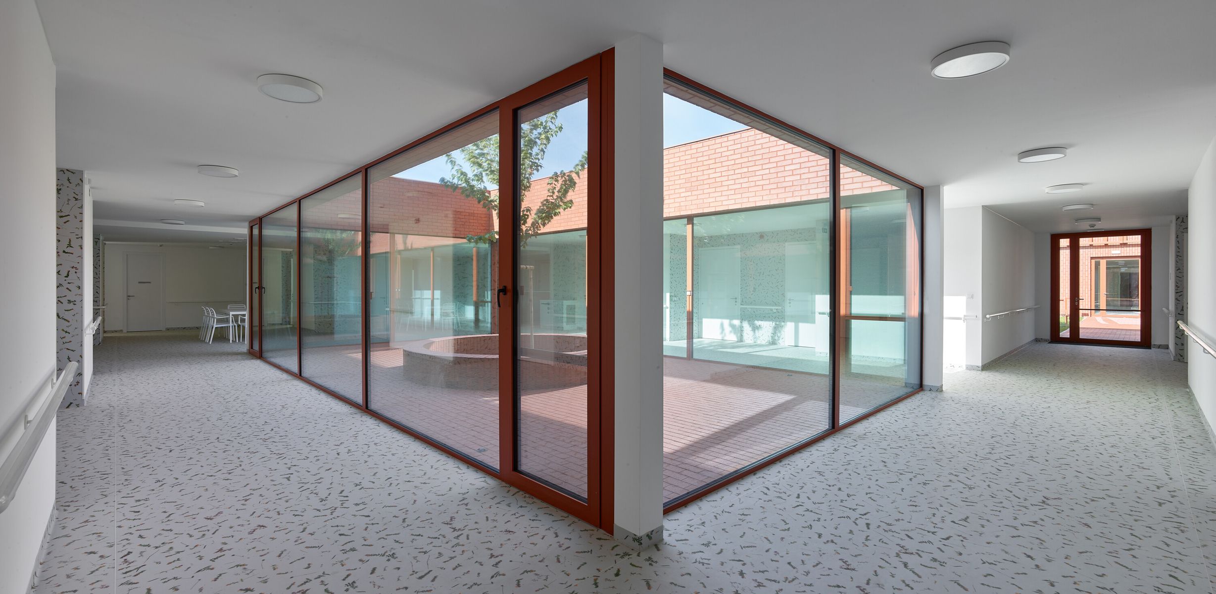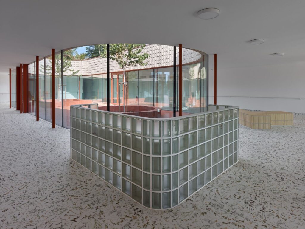 Každý pokoj má vlastní koupelnu a přímý vstup na malou terasu. Jednotlivé části domu navazují na vnitřní dvory i větší společné zahrady, díky nimž zůstává kontakt s exteriérem přítomný v celém objektu. Pohyb domem je vědomou součástí návrhu — přízemní řešení podporuje přirozenou chůzi a každodenní procházení světlem zalitými interiéry.