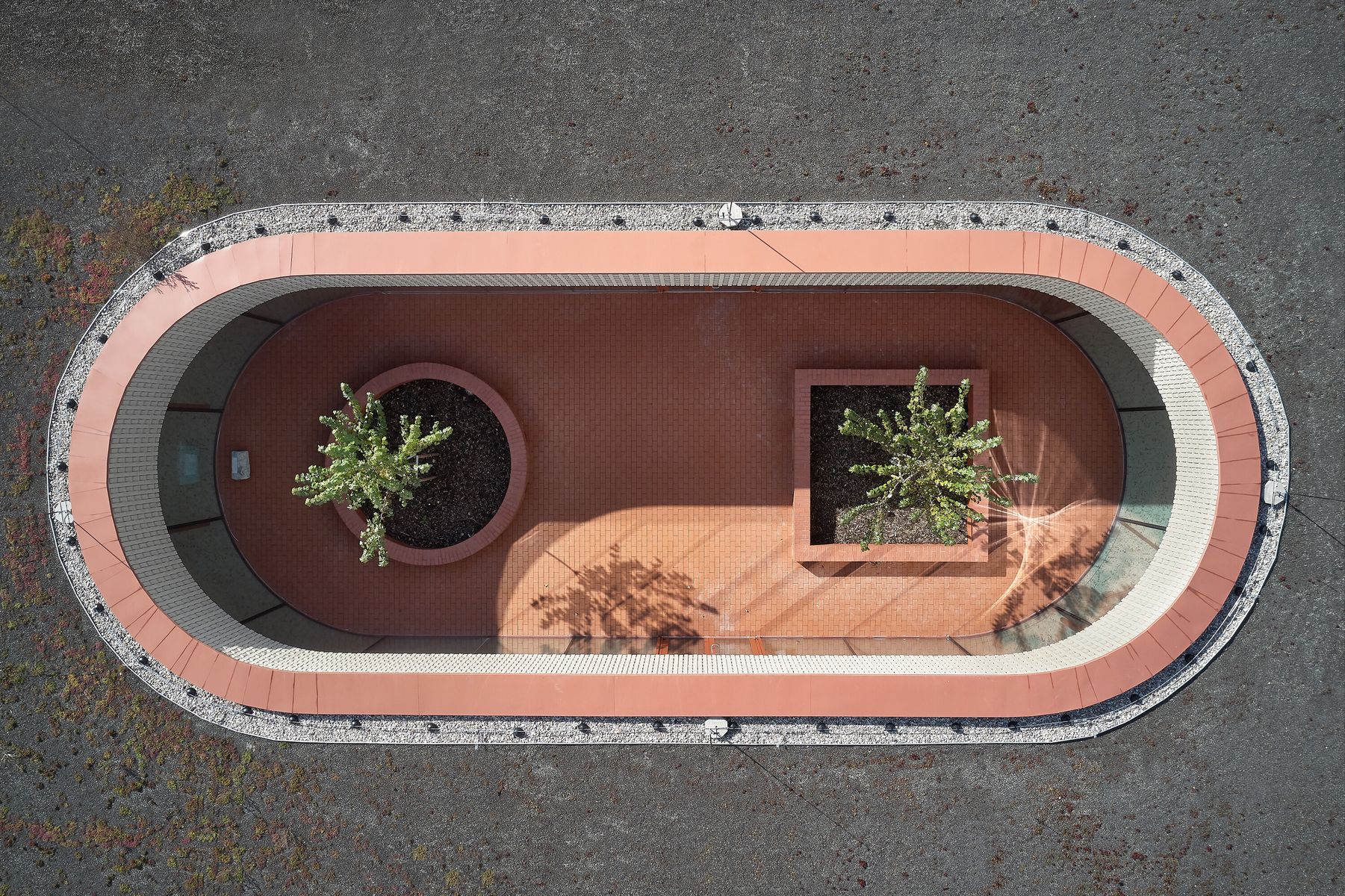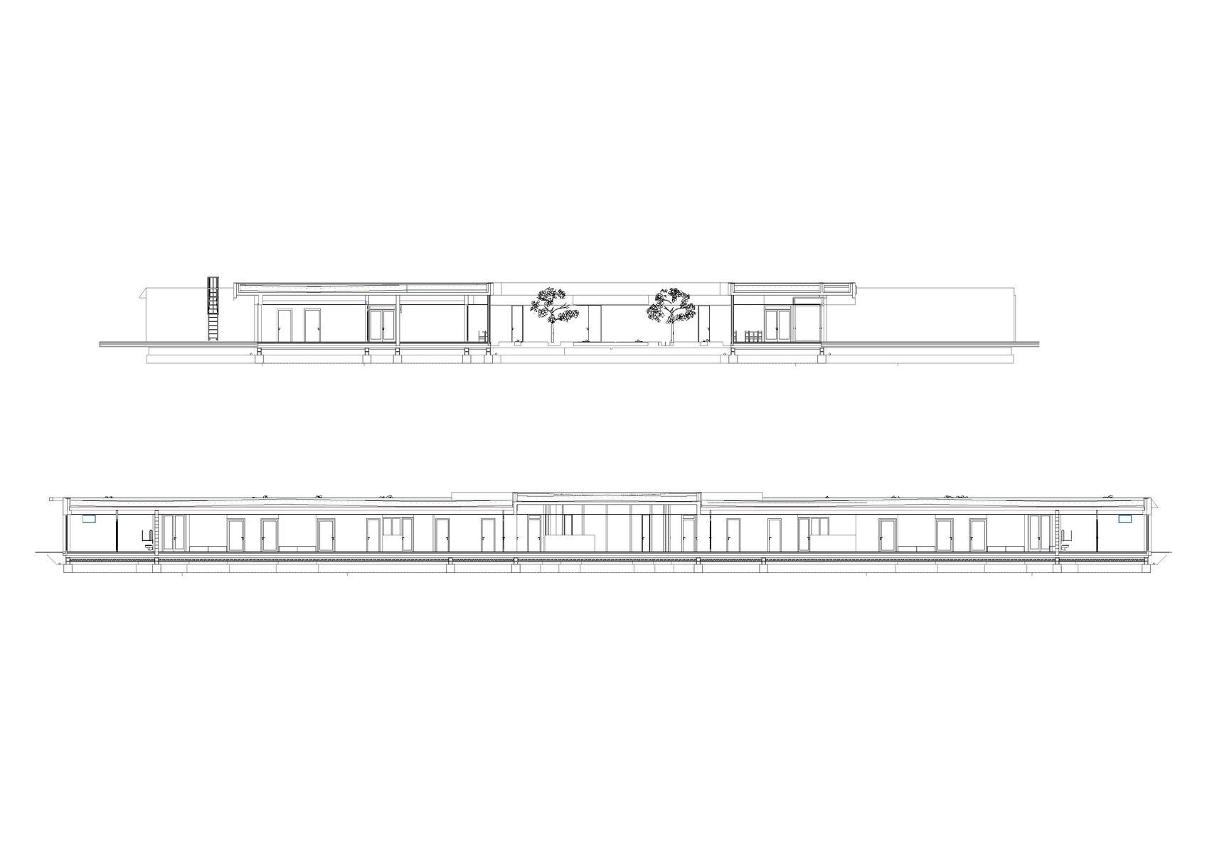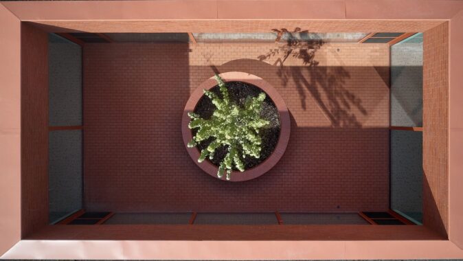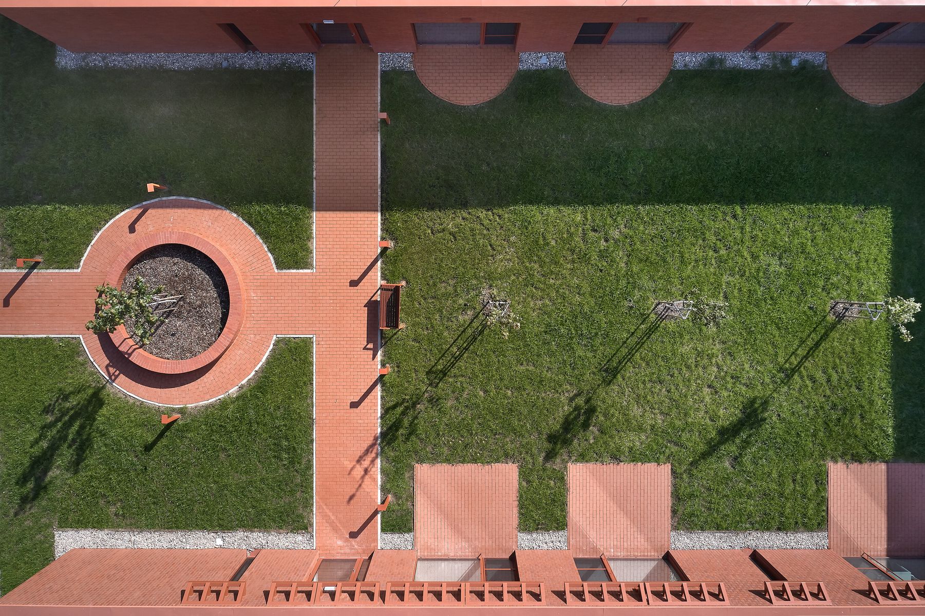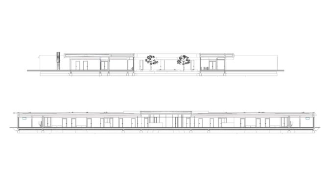 Každý pokoj má vlastní koupelnu a přímý vstup na malou terasu. Jednotlivé části domu navazují na vnitřní dvory i větší společné zahrady, díky nimž zůstává kontakt s exteriérem přítomný v celém objektu. Pohyb domem je vědomou součástí návrhu — přízemní řešení podporuje přirozenou chůzi a každodenní procházení světlem zalitými interiéry.