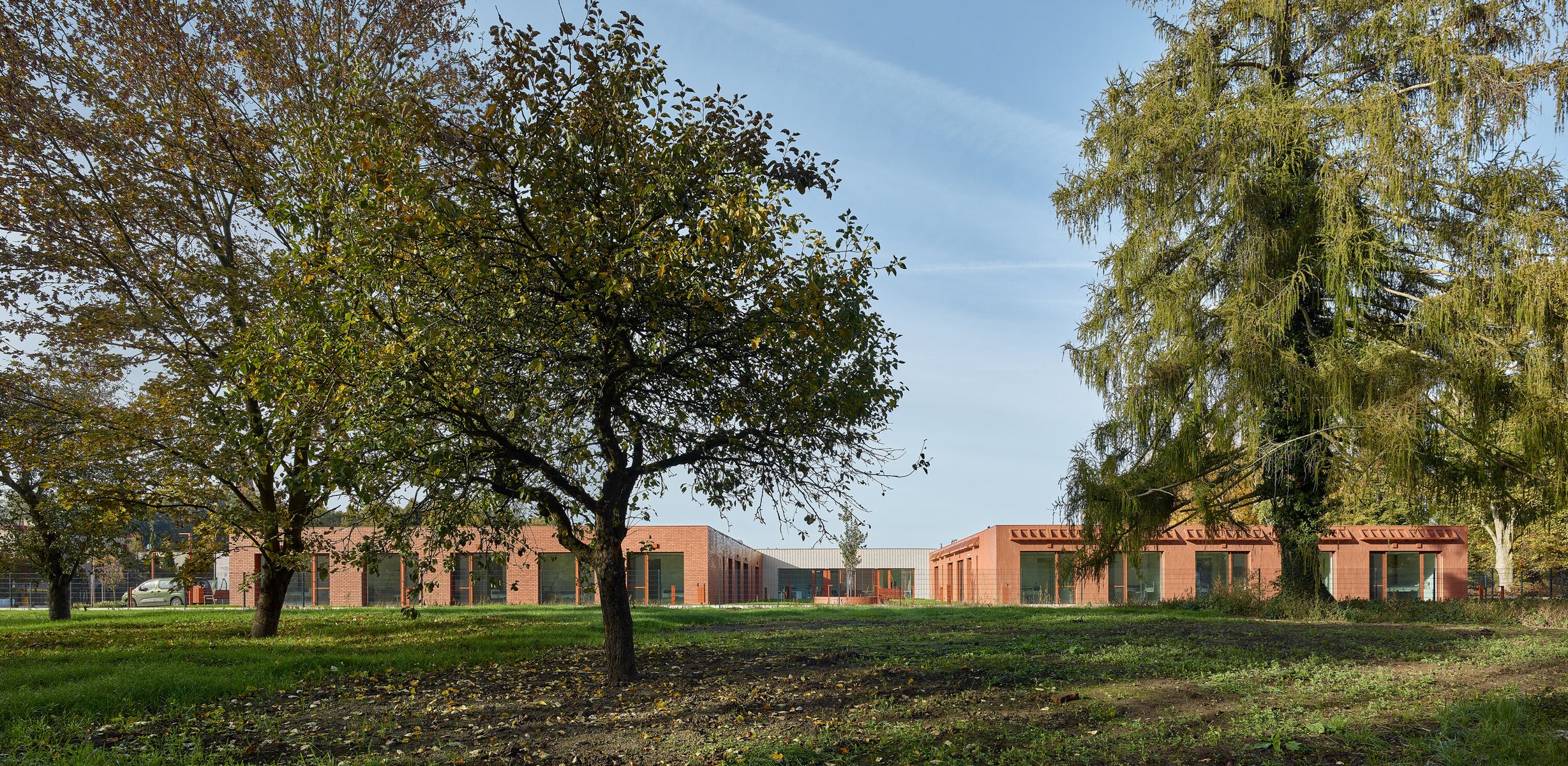 Nový domov seniorů vznikl na místě bývalého ovocného sadu na okraji Nového Bydžova, v blízkosti nemocnice a historického hřbitova s kostelem. Klidná atmosféra místa se stala základním východiskem návrhu — dům je koncipován jako nízká horizontální stavba uložená do zelené krajiny.