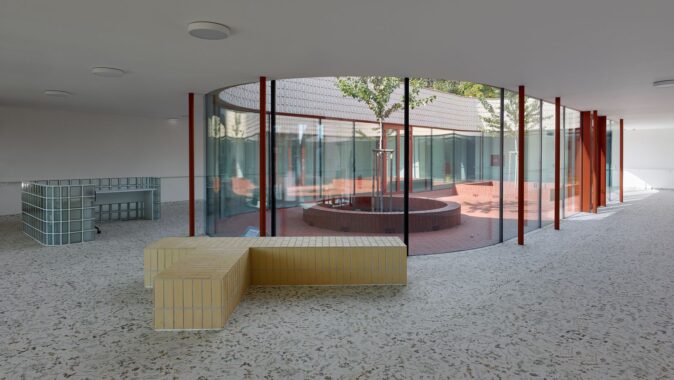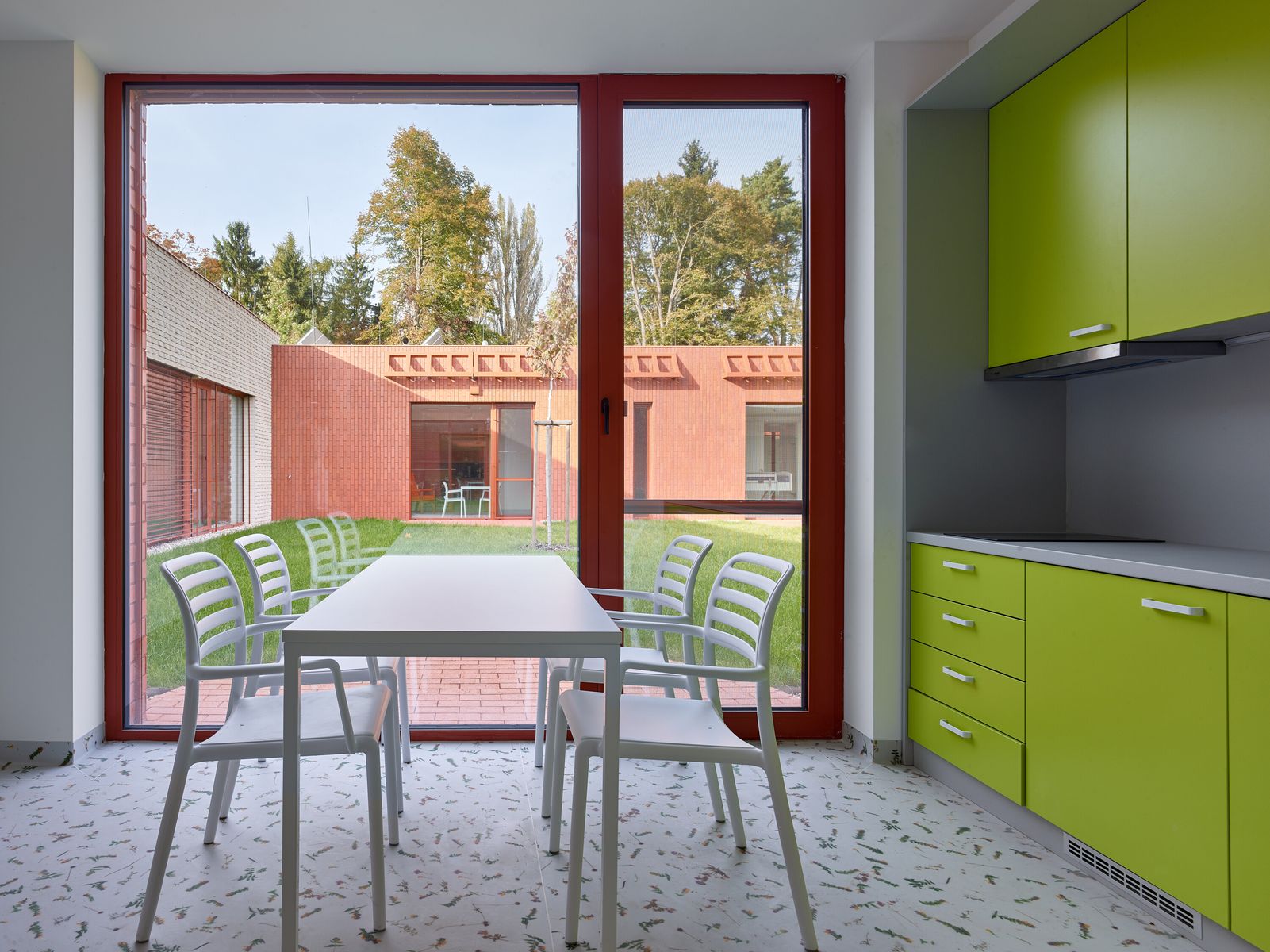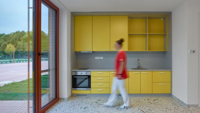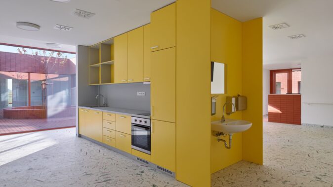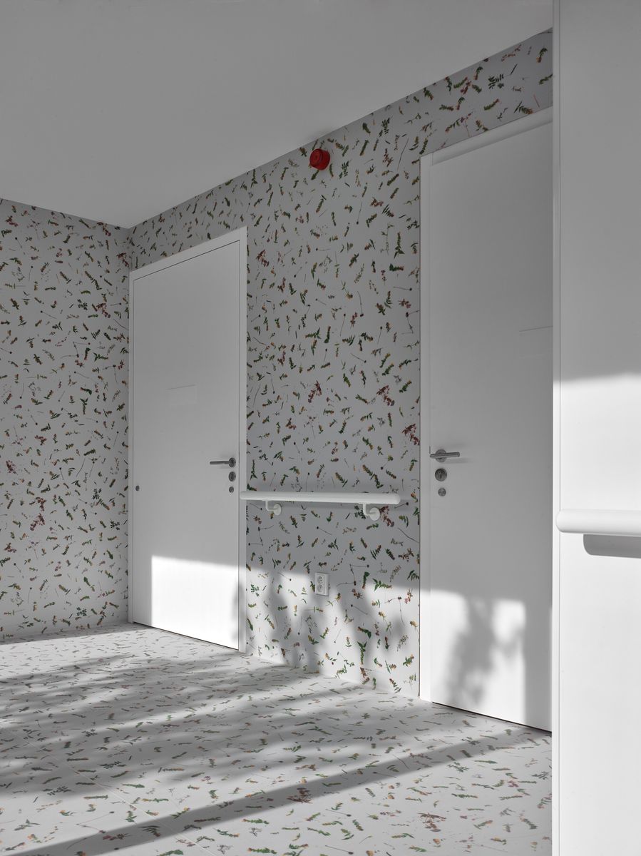 Motiv individuality pokračuje také v interiéru. Světlé prostory doplňují podlahy vytvořené z motivů místních květin a travin, které fungují jako orientační systém jednotlivých domácností a současně přinášejí do domu jemný přírodní motiv. Architektura domu nevytváří institucionální prostředí, ale klidně komponovaný celek, v němž se bydlení odehrává mezi zahradami, světlem a materiálem.