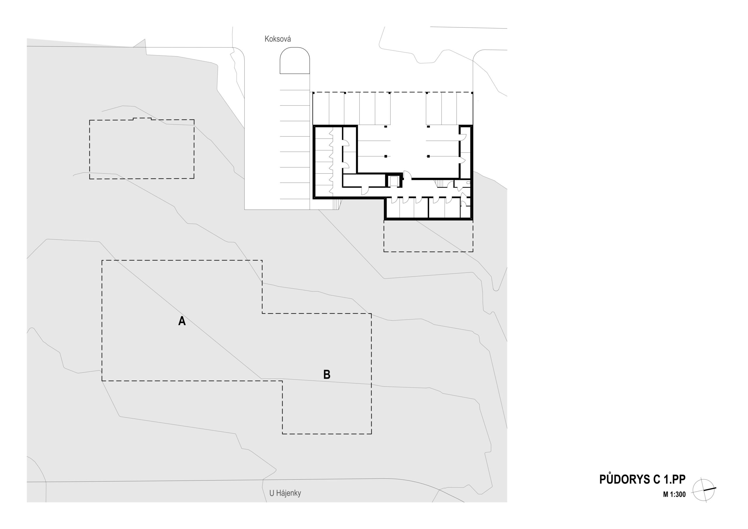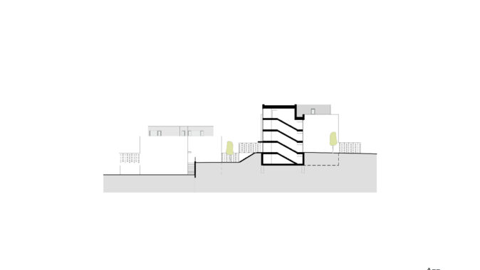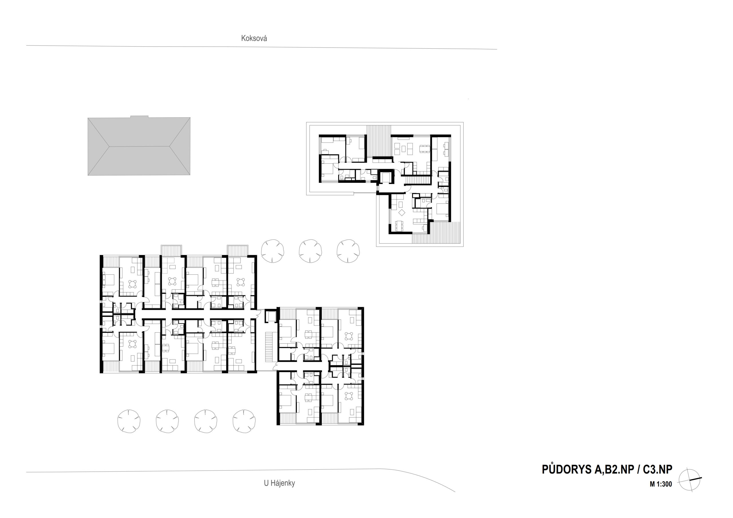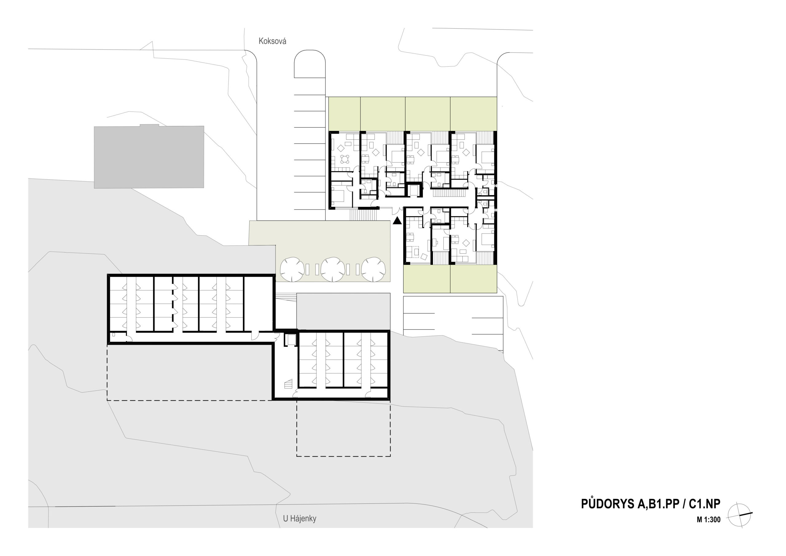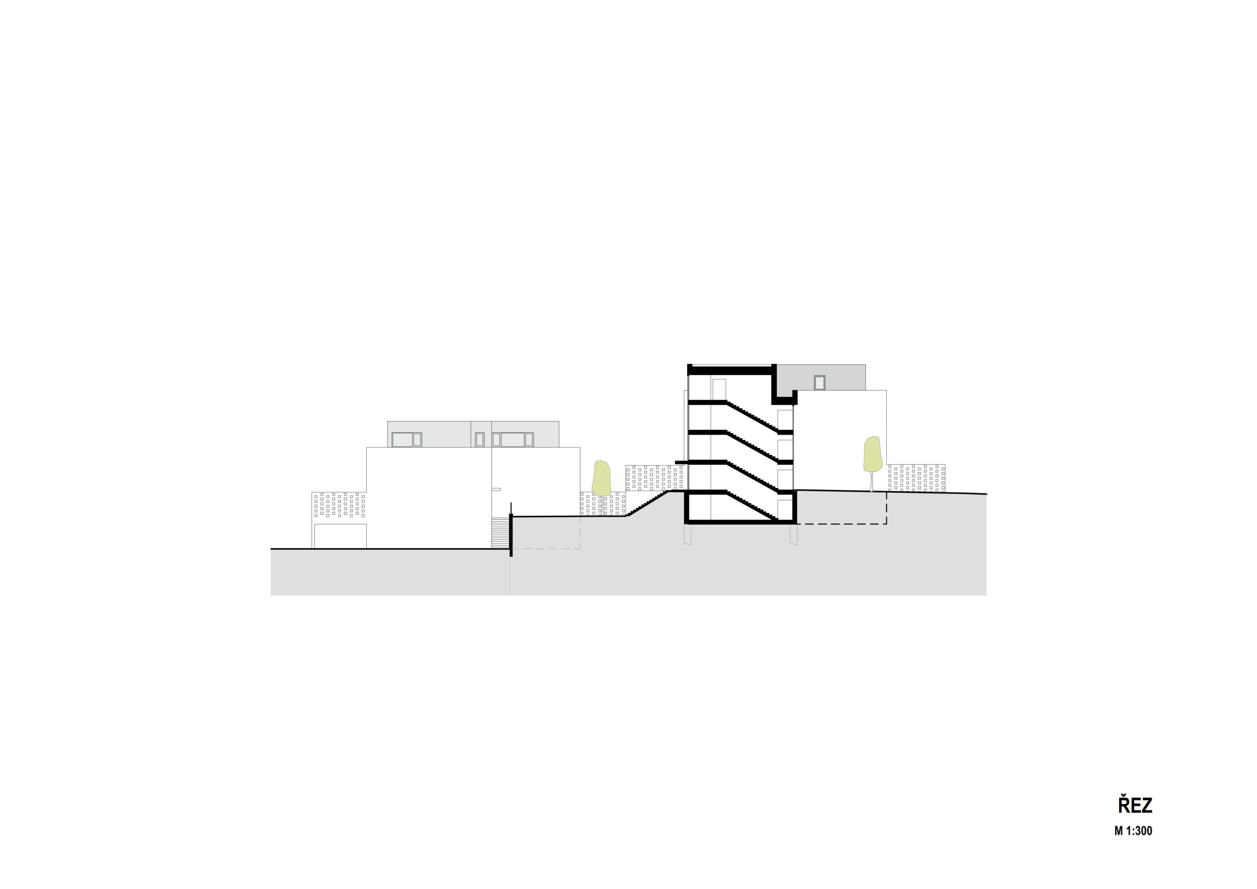 Obytný soubor je navržený jako přechodový prvek mezi nízkopodlažní zástavbou rodinných domů na severní straně a bytovými domy na straně jižní. Soubor s 53 byty je rozdělený do tří hmot, společně s předzahrádkami spodních bytů a s ustupujícím horním podlažím vytváří kompozici rozloženou po výrazné terénní depresi.