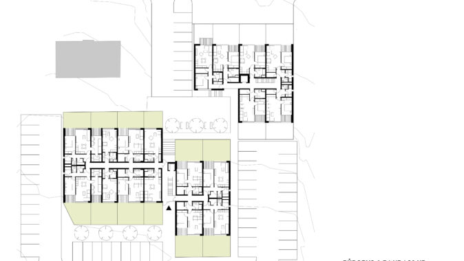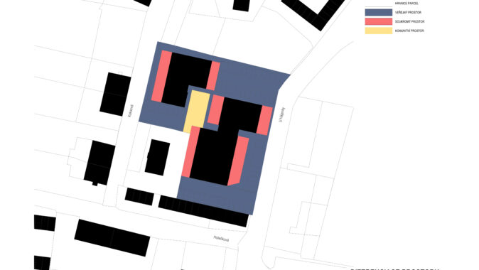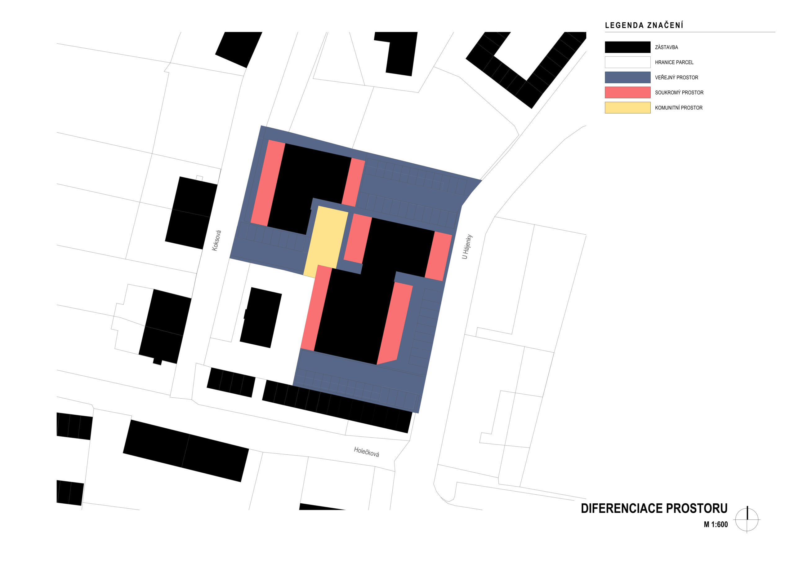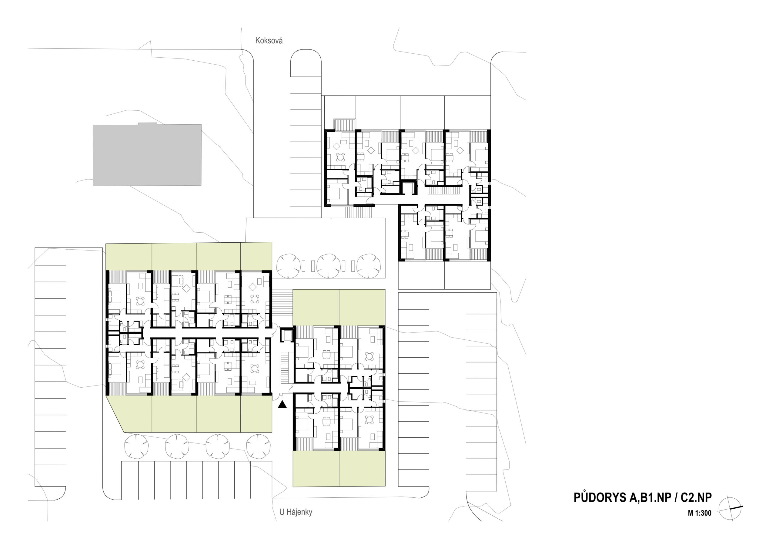 Soubor je navržený jako otevřený, průchozí. Tak, aby nevytvářel ve stávajícím území bariéru a umožňoval interakci mezi autochtony a nově příchozími. V těžišti obytného souboru je navržený polouzavřený komunitní dvůr pro vytváření sousedských vazeb. Soukromé prostory tvoří předzahrádky spodních bytů a střešní terasy bytů horních. Svažitý pozemek umožnil částečné podsklepení bytových domů, kde jsou umístěny sklepy a parkování.