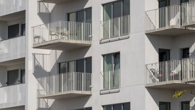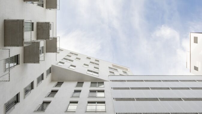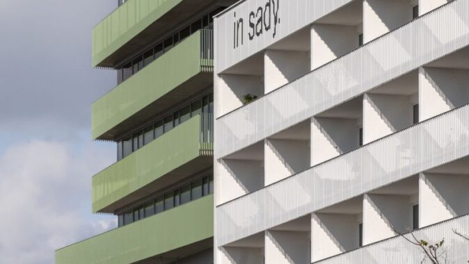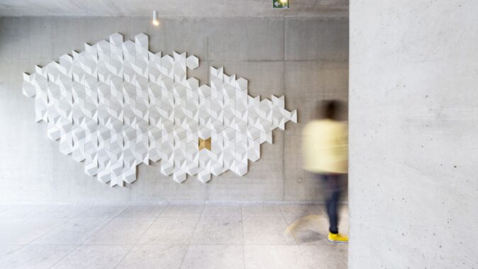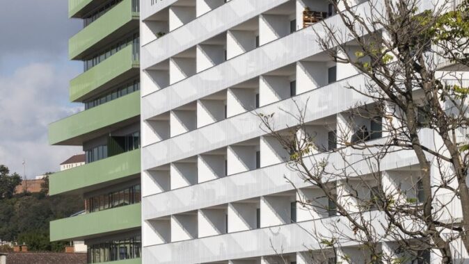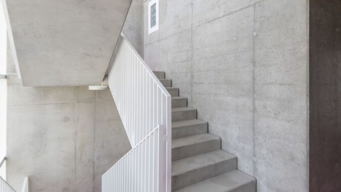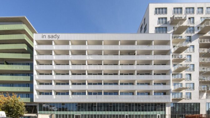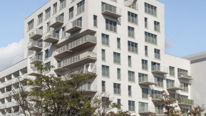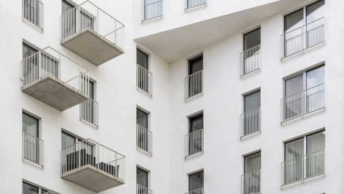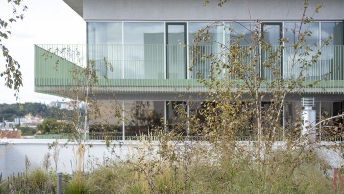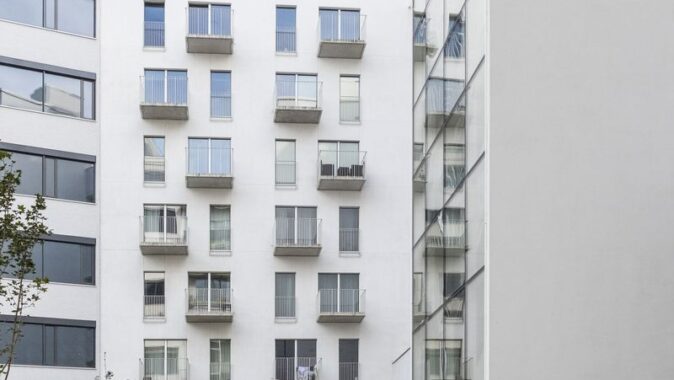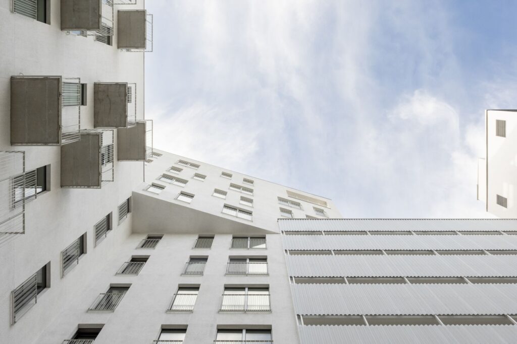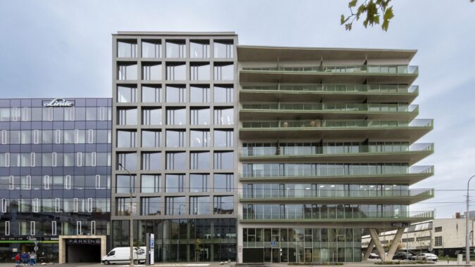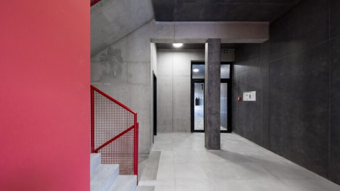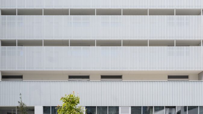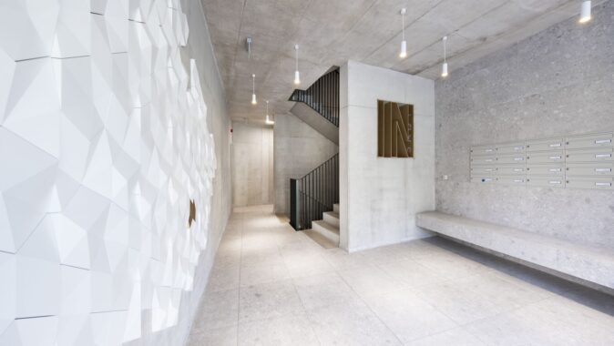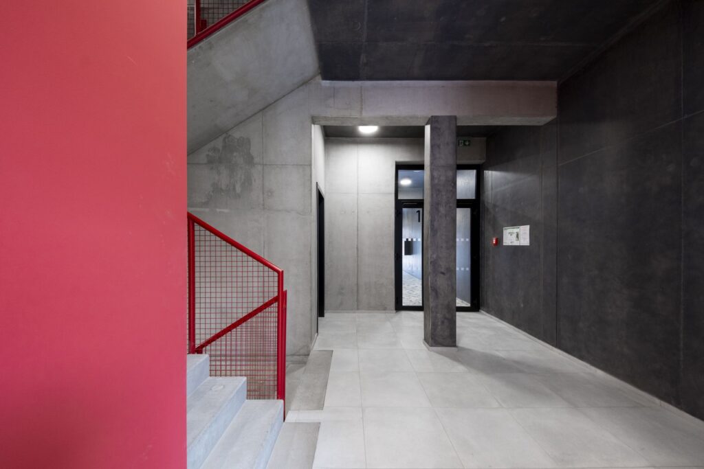 Jednotná dispozice bytů se odrazila v pravidelné fasádě orientované do ulice. Tento přísný rastr je na obou stranách budovy zjemněn perforovaným plechem, což fasádě dodává vizuální lehkost a interiérům více soukromí. Budova je provedena v čisté bílé barvě, kterou v interiéru doplňuje kombinace pohledového betonu, stěrek v malinovém odstínu a světle šedé velkoformátové dlažby.