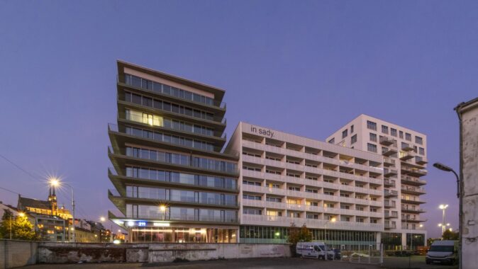 Projekt IN sady v Brně sestává ze tří částí, které zahrnují komerční, administrativní, ubytovací a bytové jednotky. Nadzemní část byla rozdělena mezi dvě architektonické kanceláře, a53 architekti a dílna, což vedlo ke vzniku tří odlišných domů.