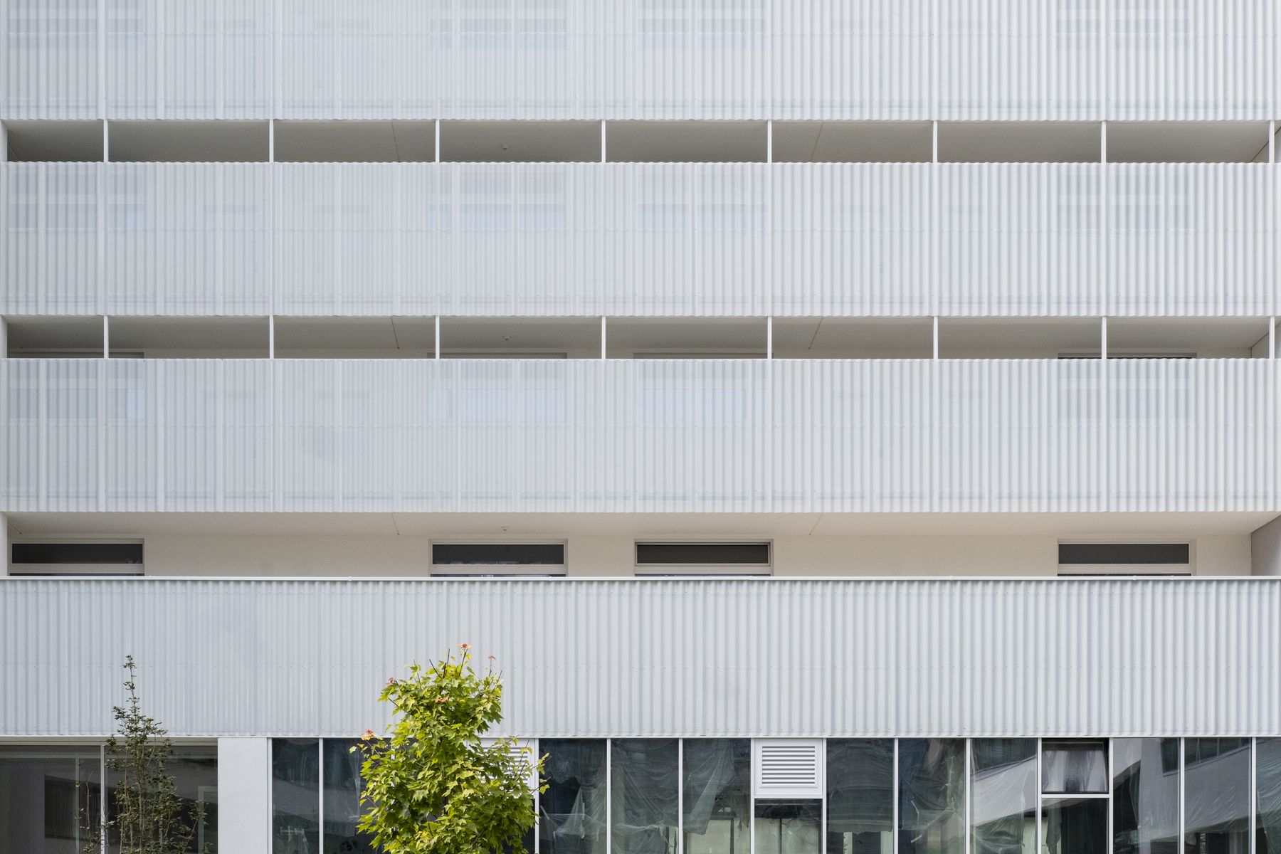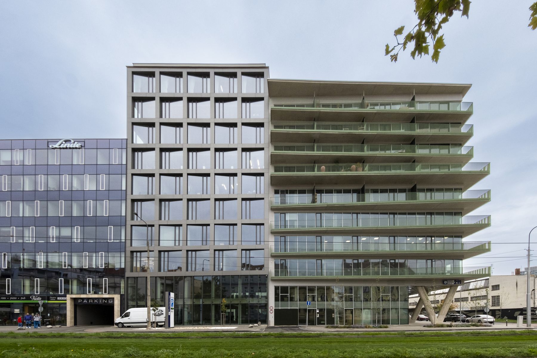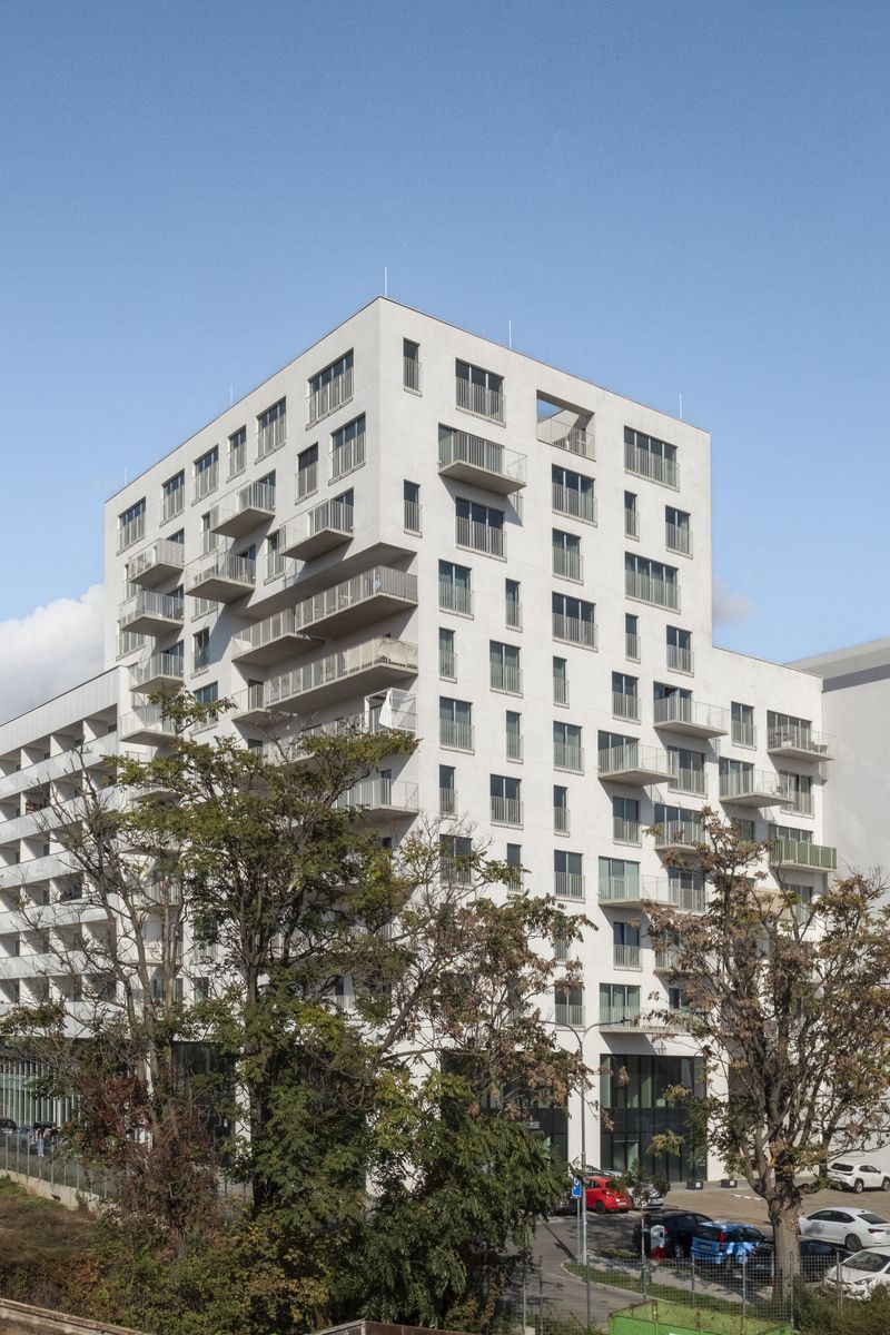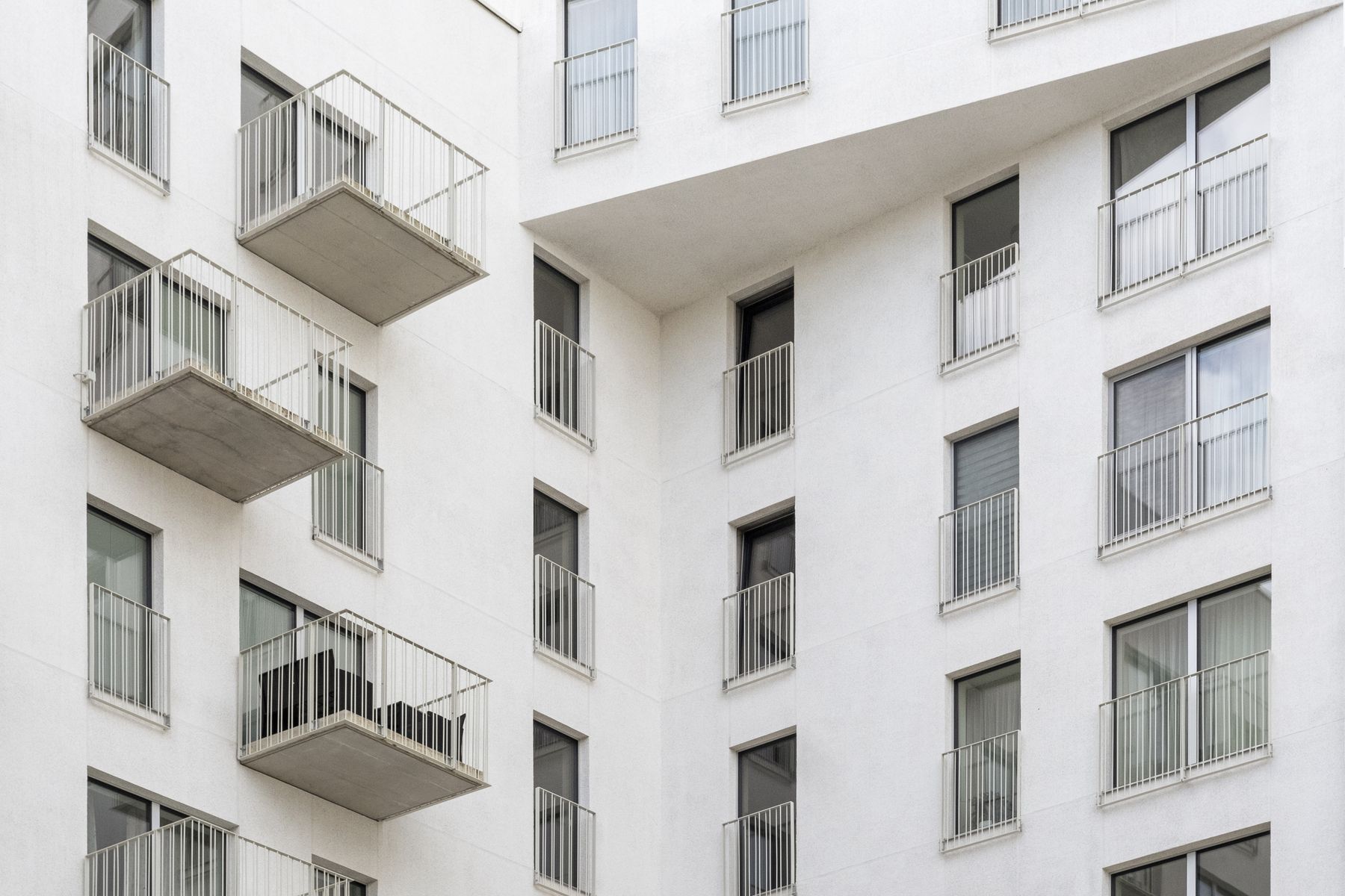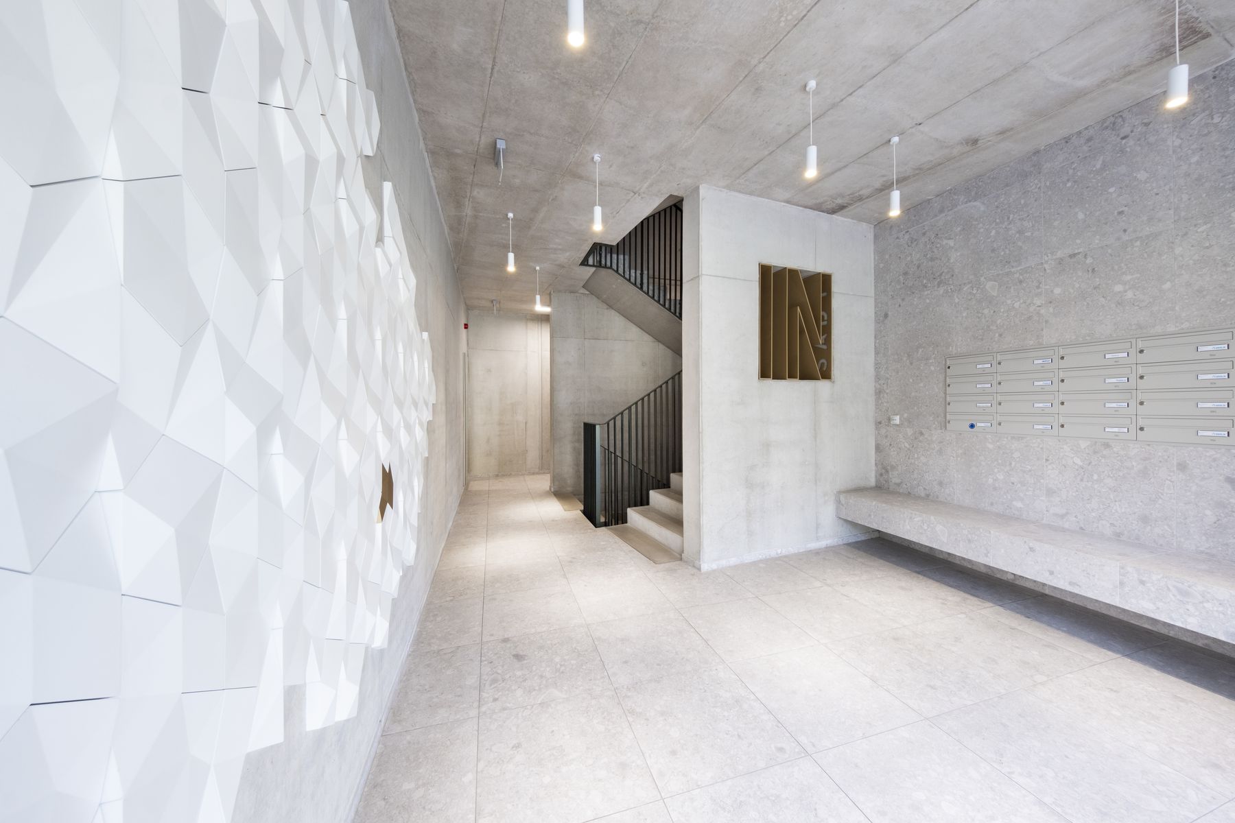 Jednotná dispozice bytů se odrazila v pravidelné fasádě orientované do ulice. Tento přísný rastr je na obou stranách budovy zjemněn perforovaným plechem, což fasádě dodává vizuální lehkost a interiérům více soukromí. Budova je provedena v čisté bílé barvě, kterou v interiéru doplňuje kombinace pohledového betonu, stěrek v malinovém odstínu a světle šedé velkoformátové dlažby.