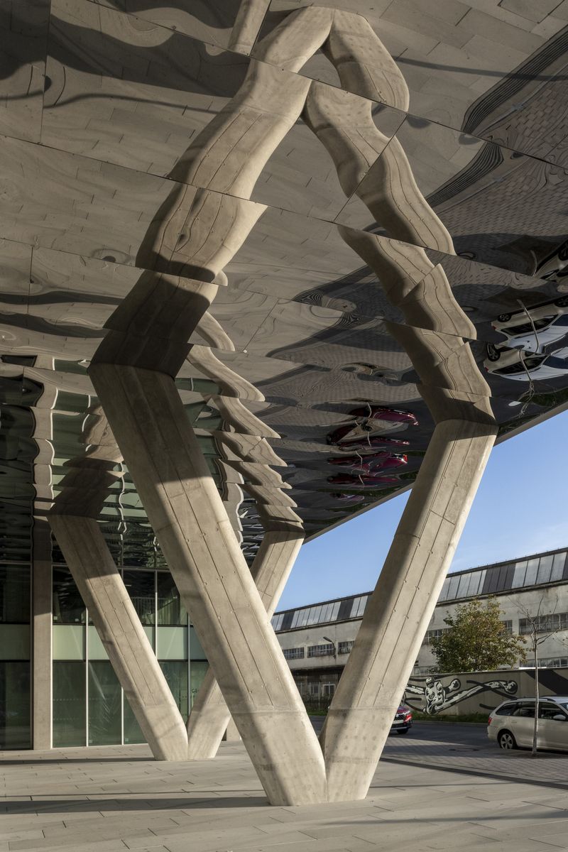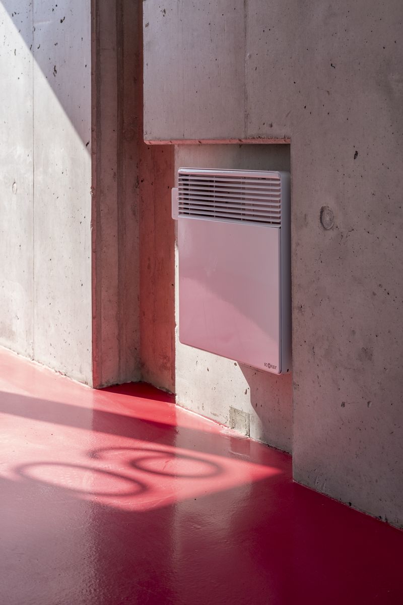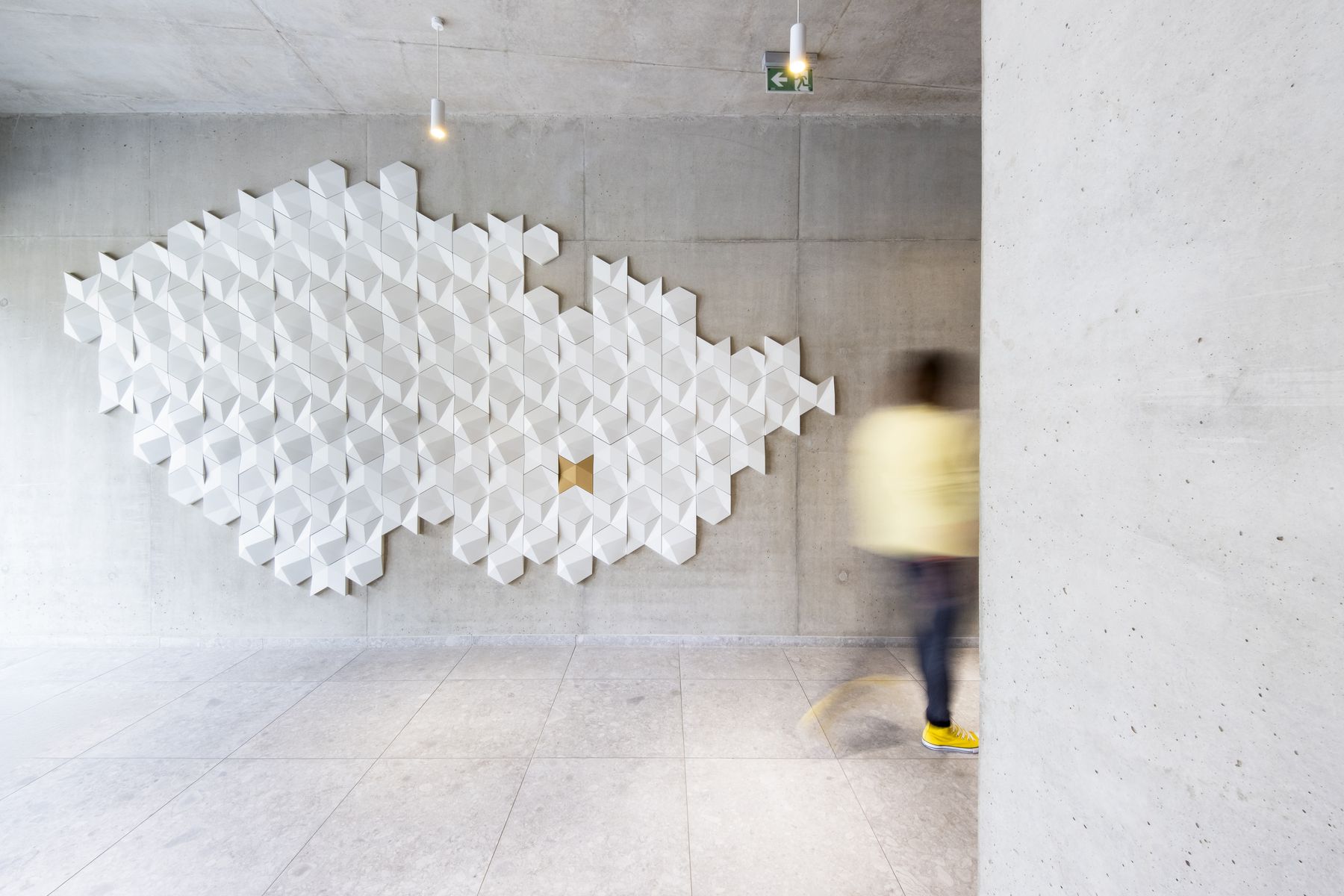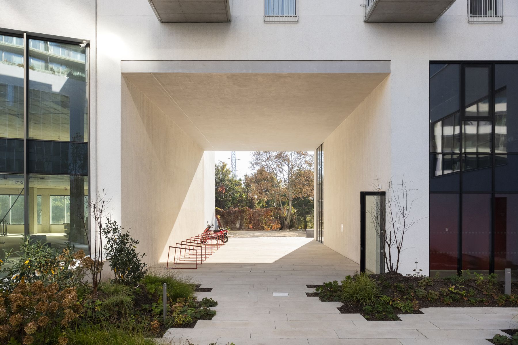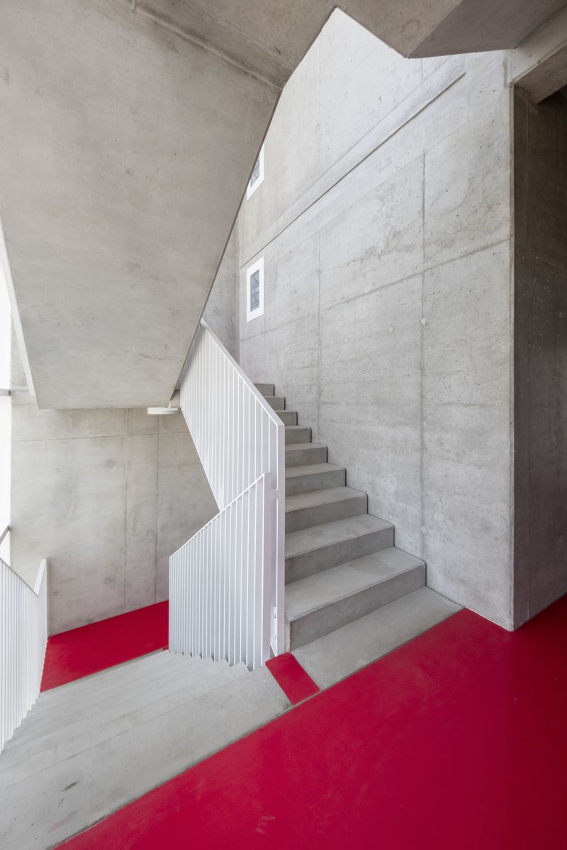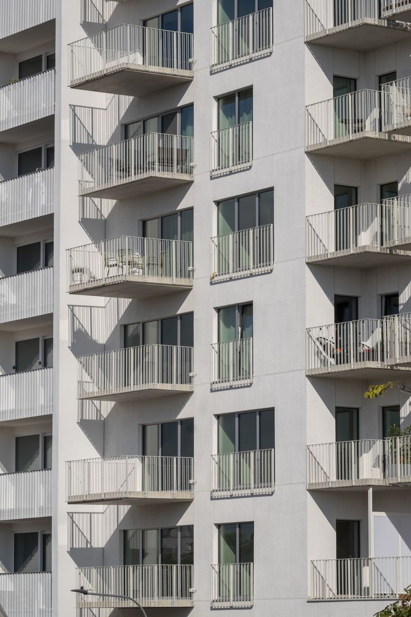Jednotná dispozice bytů se odrazila v pravidelné fasádě orientované do ulice. Tento přísný rastr je na obou stranách budovy zjemněn perforovaným plechem, což fasádě dodává vizuální lehkost a interiérům více soukromí. Budova je provedena v čisté bílé barvě, kterou v interiéru doplňuje kombinace pohledového betonu, stěrek v malinovém odstínu a světle šedé velkoformátové dlažby.