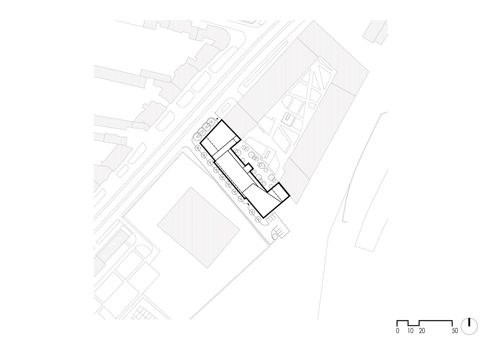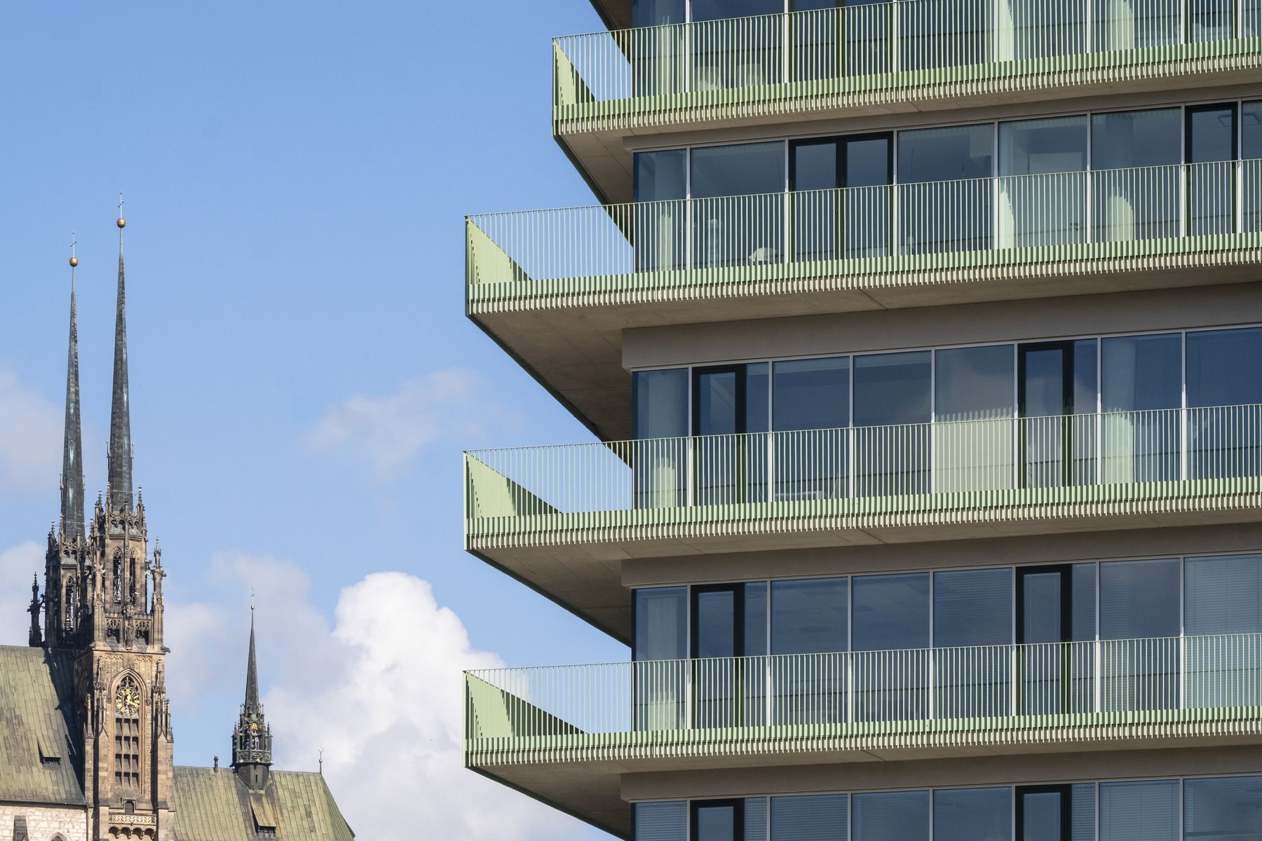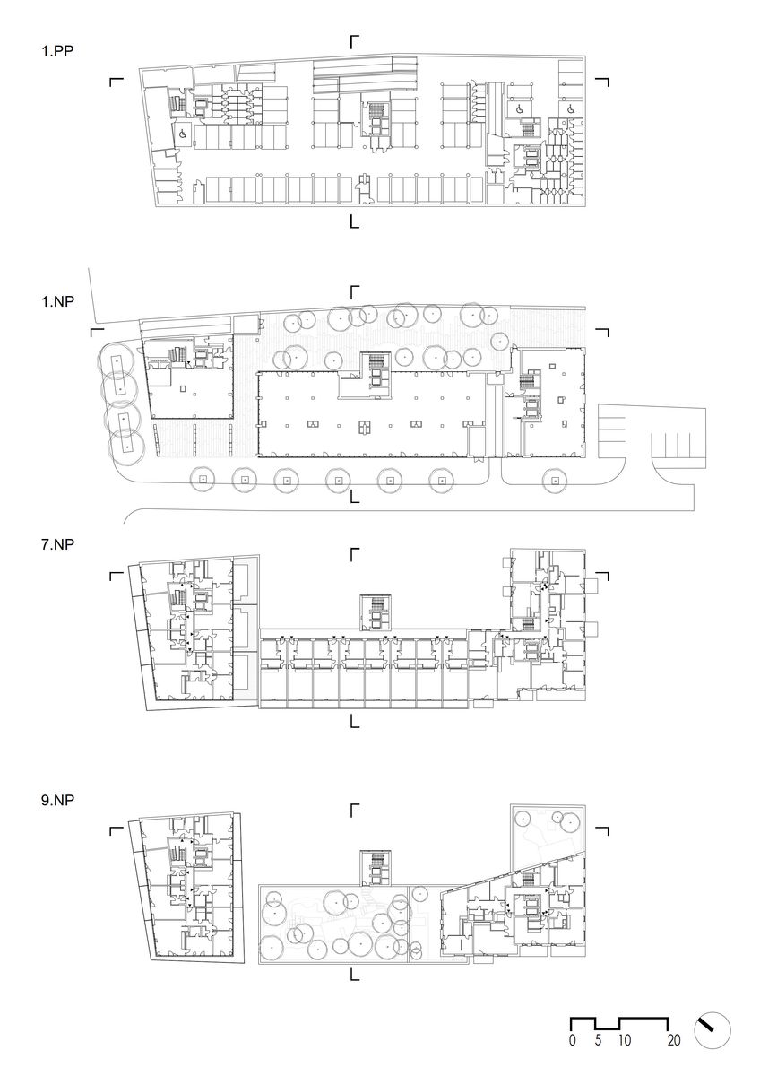 Ačkoli je podzemní podlaží propojuje, jednotlivé domy se liší provozem, uspořádáním a funkcí. Zároveň žádný z architektů neměl možnost ovlivňovat práci toho druhého a výsledek vychází z konceptu „rostlého města“. Uvnitř bloku se nachází společné, veřejně přístupné prostranství. Parter nabízí administrativní a obchodní prostory, do nichž vedou dva hlavní vstupy – z nároží ulice Nové sady a z jihovýchodní části.