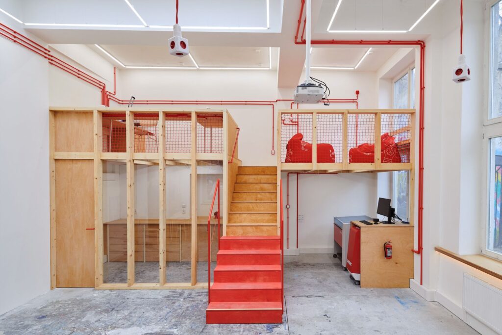 Prosvětlená místnost s vysokými stropy a střešním světlíkem původně sloužila jako výtvarný ateliér FAVU. Velkorysý prostor umožnil vertikální práci s prostorem a díky dřevěným vestavbám tak autorka vytvořila dostatek samostatně oddělených prostor pro práci na jednotlivých technologiích (laserové řezačce, 3D tiskárnách, programovatelný vyšívací stroj, řezací plotter) i oddělenou dílnu pro úpravu výrobků ze dřeva.