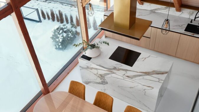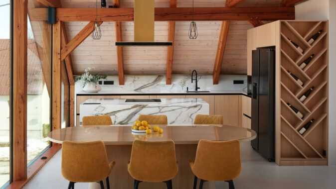 Už při vstupu do bytu upoutá pozornost podsvícená silueta Ještědu, která je součástí centrální multifunkční šatní kostky. Tento prvek nejen prakticky rozděluje prostor, ale zároveň vytváří vizuální dominantu bytu. Zrcadlová plocha v obývací části vizuálně zvětšuje prostor a odráží okolní krajinu, čímž umocňuje propojení interiéru s exteriérem. Kuchyň jsem navrhla tak, aby byla funkční, ale zároveň esteticky nadčasová. Kombinace přírodního dubu a mramoru Calacatta dodává prostoru noblesu, zatímco kuchyňský ostrůvek funguje jako přirozené centrum dění – místo pro přípravu jídla i neformální setkávání.