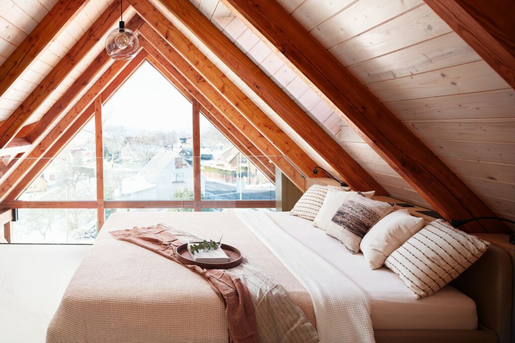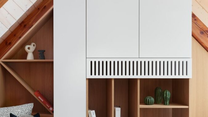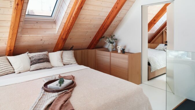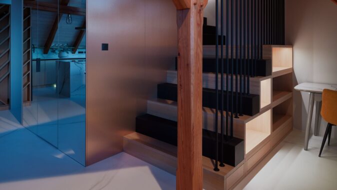Schodiště, které vede do podkrovní ložnice, jsem koncipovala tak, aby bylo nejen elegantní, ale i praktické. Pod ním jsem vytvořila pracovní kout a knihovnu, což byl jeden z momentů, kdy se estetika musela propojit s maximální funkčností. Ložnice je navržena jako otevřený prostor, který podtrhuje vzdušnost celého bytu. V dětském pokoji jsem se snažila propojit funkčnost s hravostí. Nábytek na míru vychází z tradičního řemeslného zpracování, ale přináší moderní variabilitu, aby mohl růst společně s dítětem.