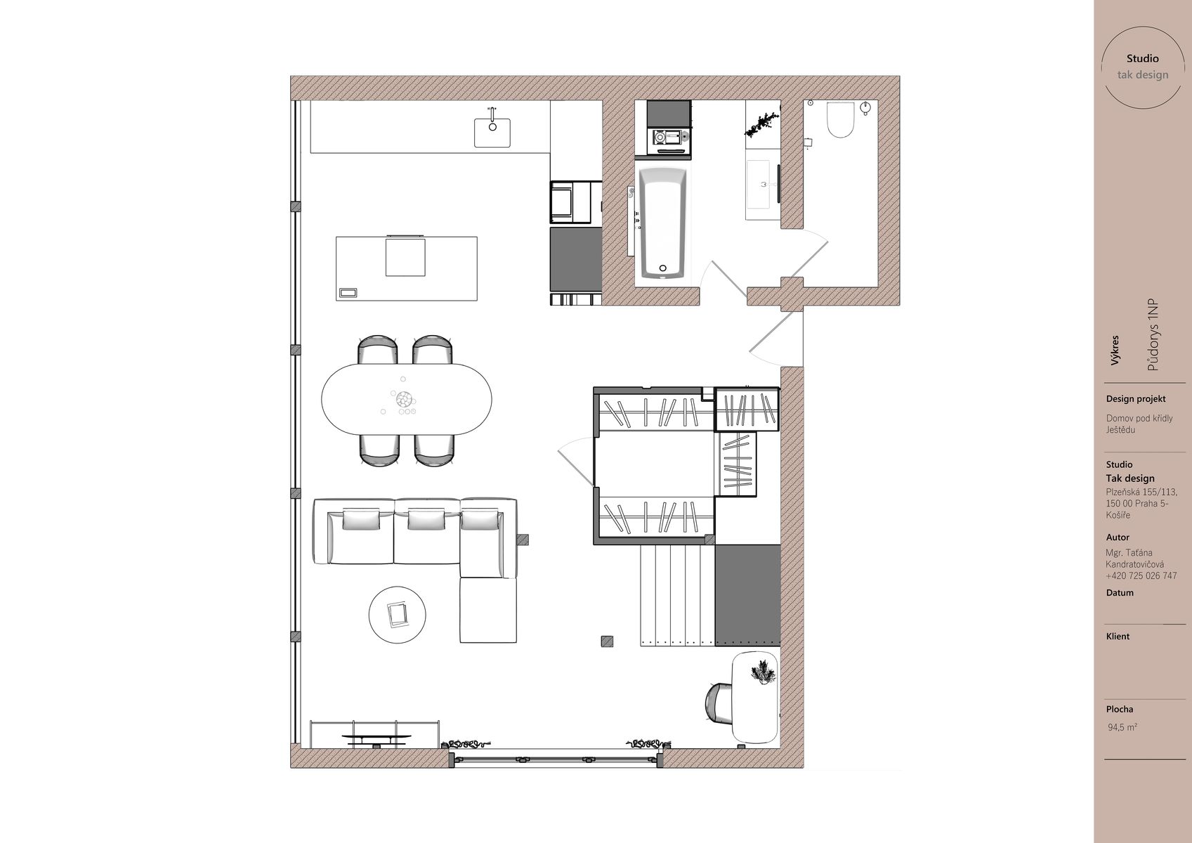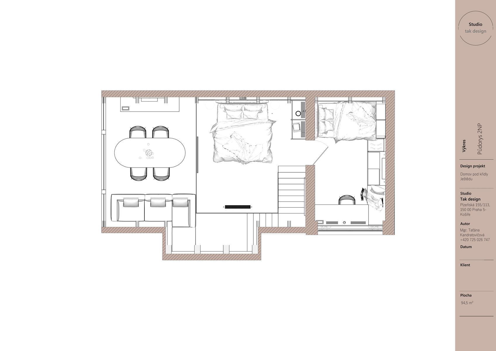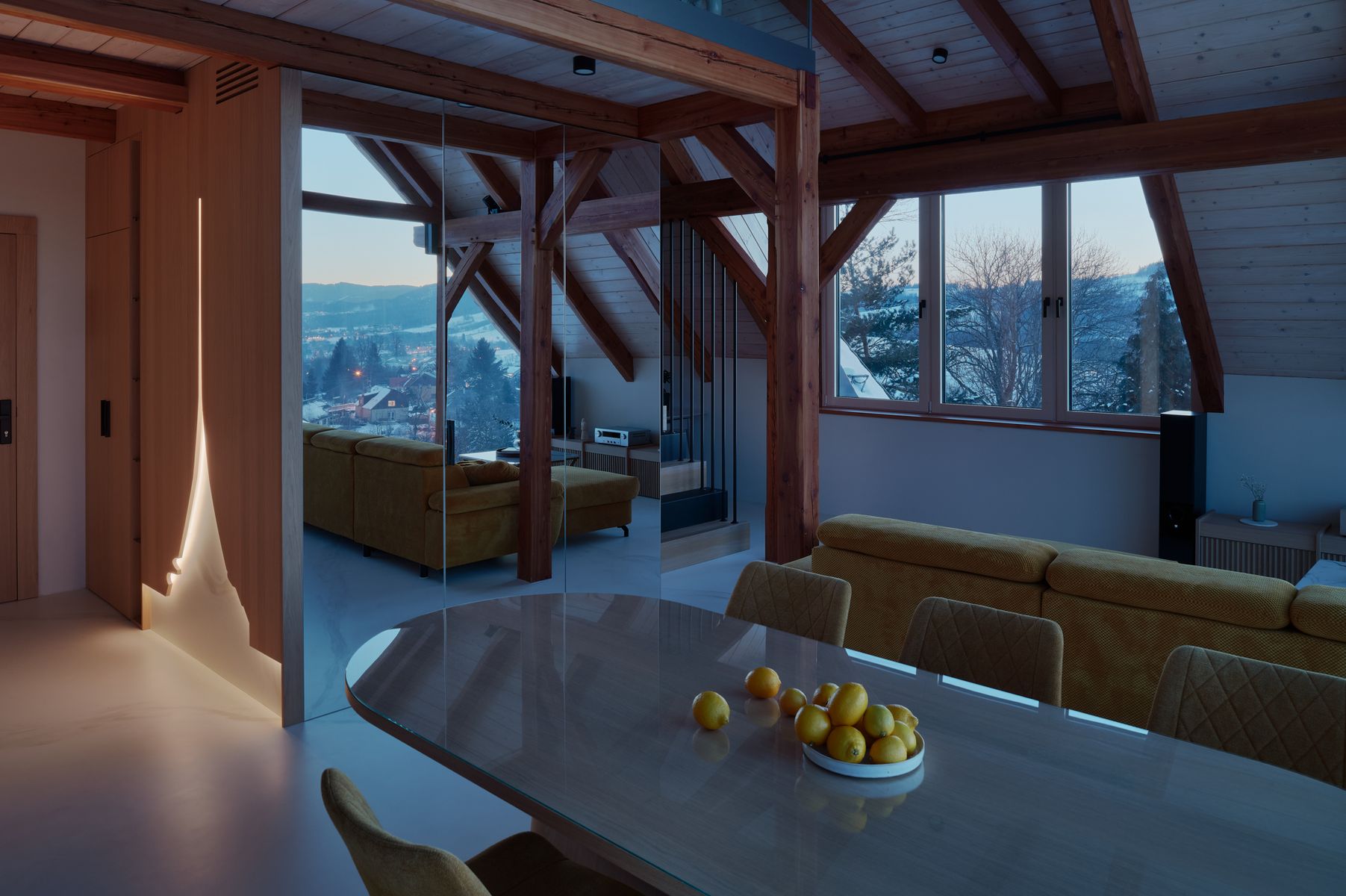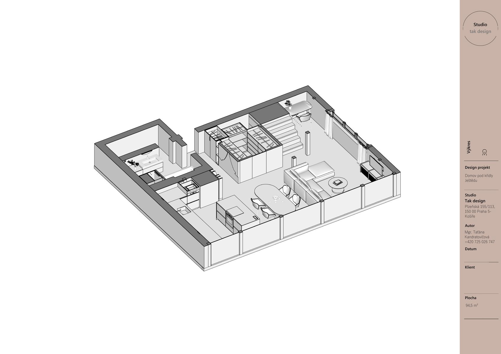 Když jsem začínala pracovat na tomto projektu, věděla jsem, že chci vytvořit interiér, který nebude jen krásný, ale bude mít i hlubší propojení s místem, kde se nachází. Hora Ještěd se stala nejen inspirací, ale i symbolickým prvkem, který se promítá do celého prostoru. Mezonetový byt je součástí moderní roubenky a jeho koncepce spočívá v harmonii tradičních materiálů a moderního designu.