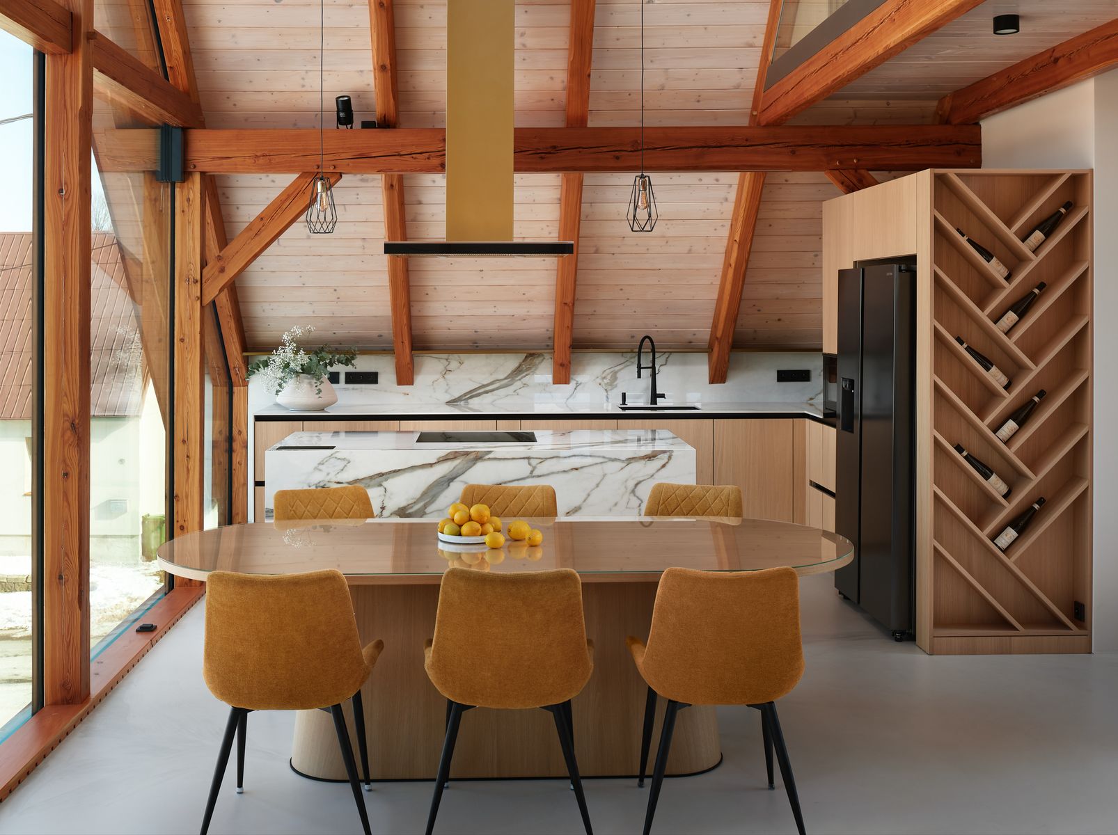 Už při vstupu do bytu upoutá pozornost podsvícená silueta Ještědu, která je součástí centrální multifunkční šatní kostky. Tento prvek nejen prakticky rozděluje prostor, ale zároveň vytváří vizuální dominantu bytu. Zrcadlová plocha v obývací části vizuálně zvětšuje prostor a odráží okolní krajinu, čímž umocňuje propojení interiéru s exteriérem. Kuchyň jsem navrhla tak, aby byla funkční, ale zároveň esteticky nadčasová. Kombinace přírodního dubu a mramoru Calacatta dodává prostoru noblesu, zatímco kuchyňský ostrůvek funguje jako přirozené centrum dění – místo pro přípravu jídla i neformální setkávání.