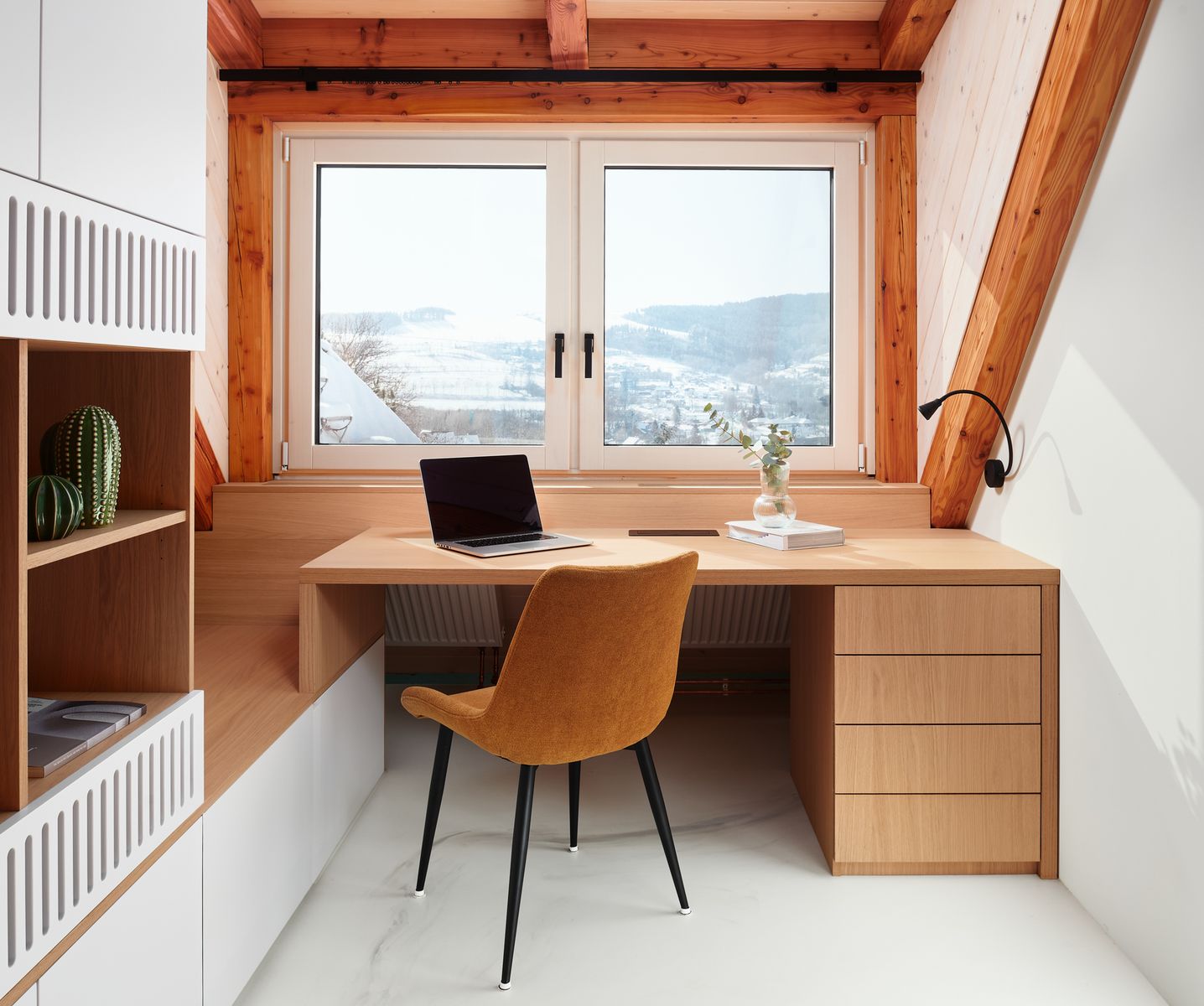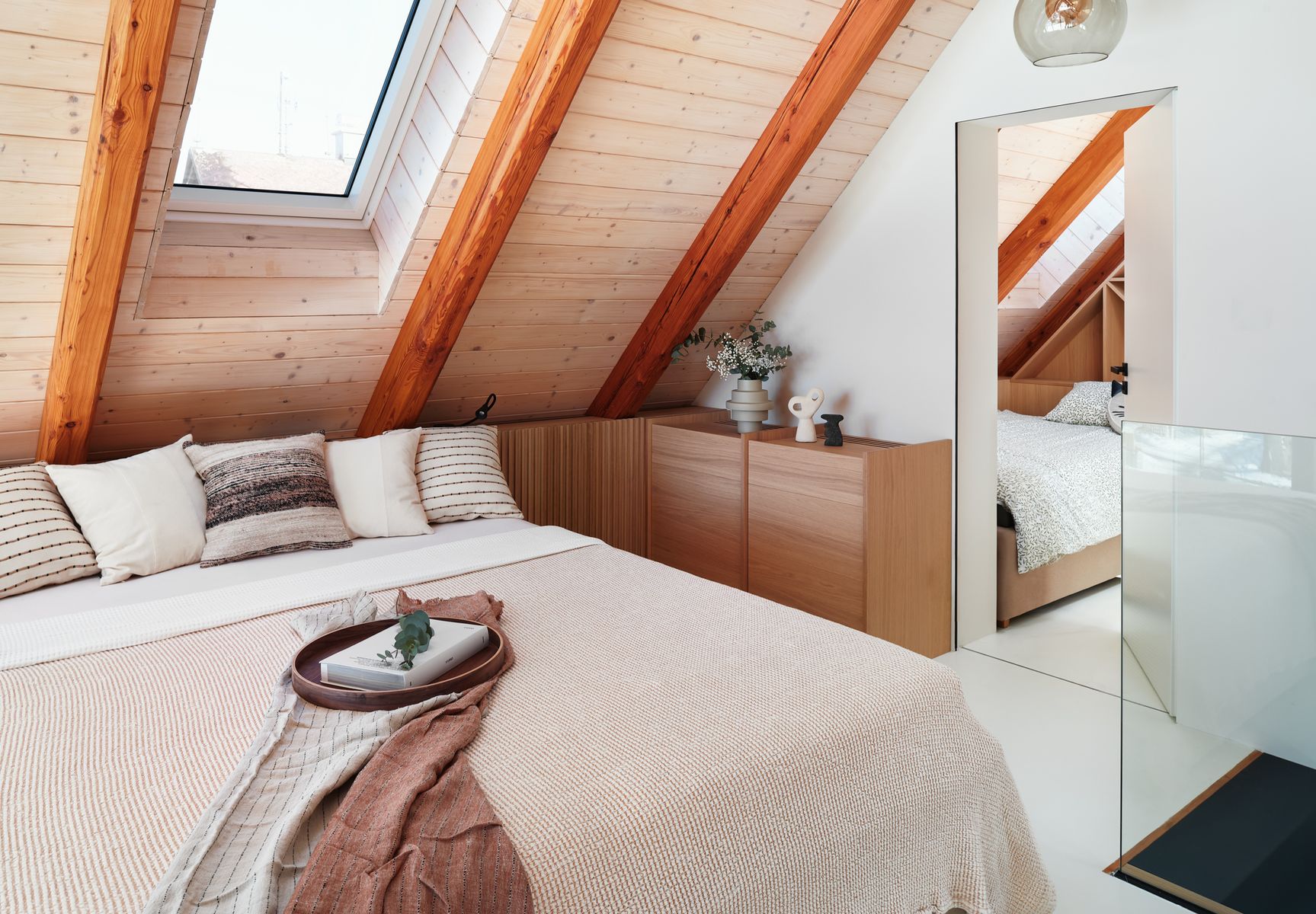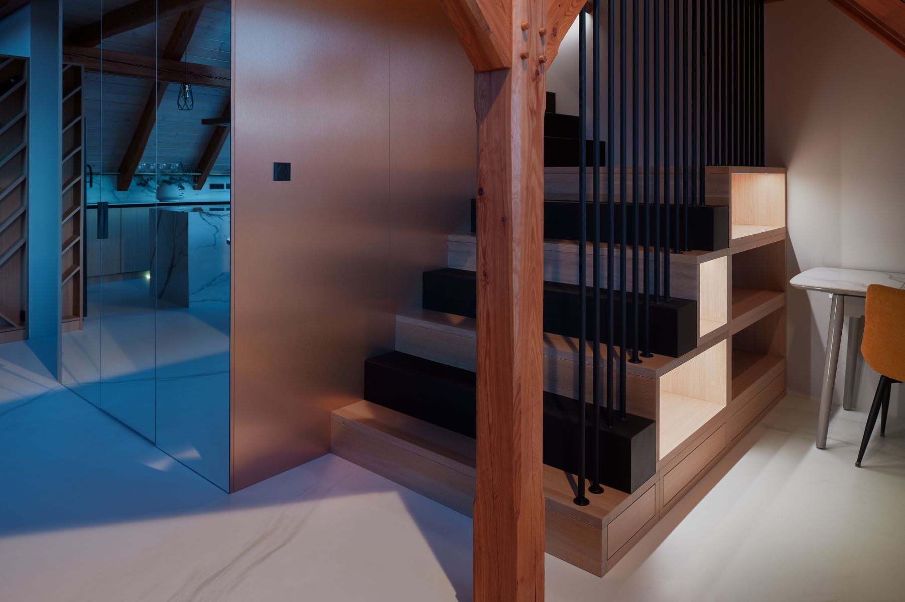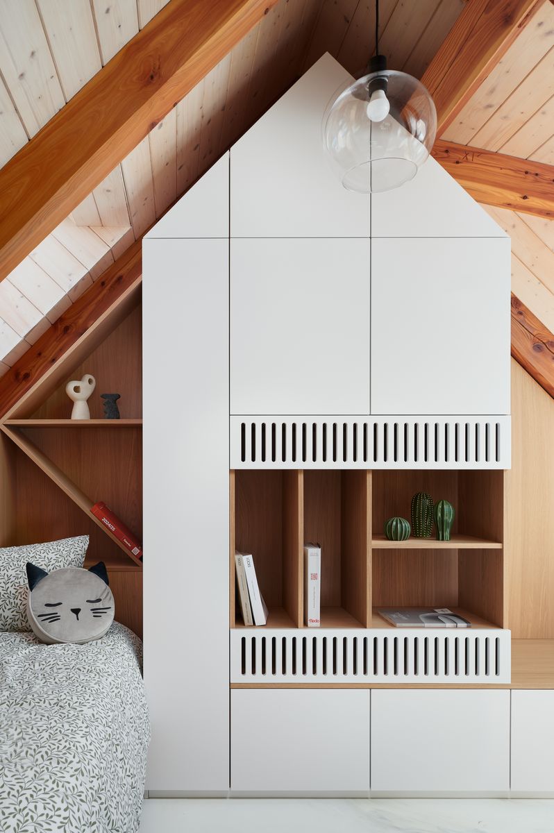 Schodiště, které vede do podkrovní ložnice, jsem koncipovala tak, aby bylo nejen elegantní, ale i praktické. Pod ním jsem vytvořila pracovní kout a knihovnu, což byl jeden z momentů, kdy se estetika musela propojit s maximální funkčností. Ložnice je navržena jako otevřený prostor, který podtrhuje vzdušnost celého bytu. V dětském pokoji jsem se snažila propojit funkčnost s hravostí. Nábytek na míru vychází z tradičního řemeslného zpracování, ale přináší moderní variabilitu, aby mohl růst společně s dítětem.