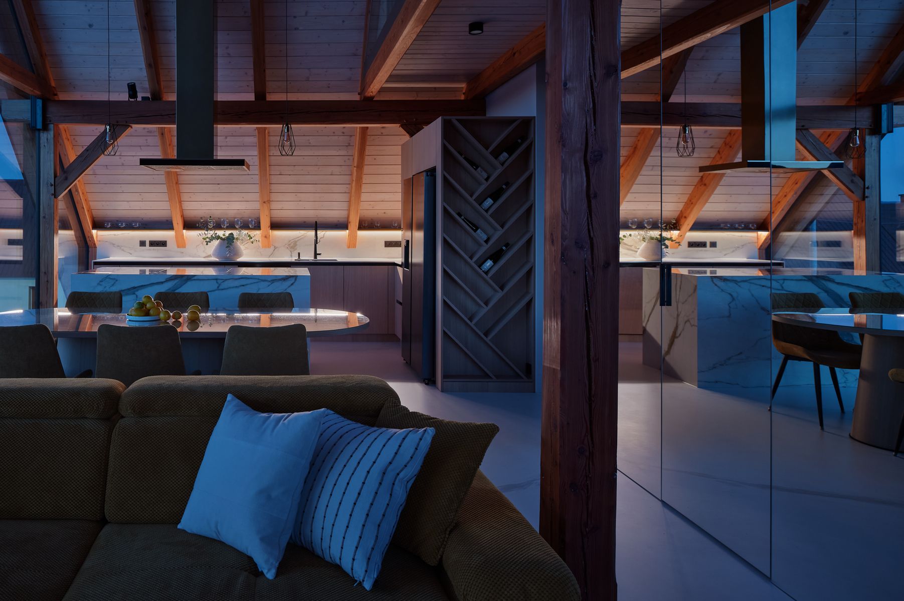 Při návrhu tohoto interiéru pro mě bylo zásadní vytvořit prostor, který není pouze vizuálně atraktivní, ale především pohodlný a smysluplný. Chytrá domácnost, vinotéka ve tvaru stromu a další prvky přispívají k tomu, aby byl život v tomto bytě nejen praktický, ale i inspirativní. Projekt je pro mě výjimečný nejen svou lokalitou, ale i příběhem, který v sobě nese. Je to domov, kde se design setkává s krajinou a kde se každý detail podílí na atmosféře klidu a harmonie.