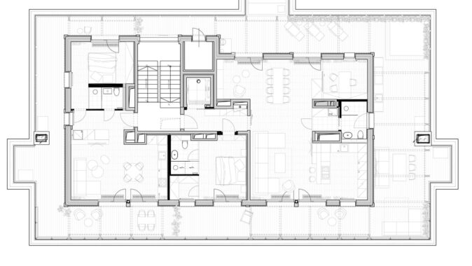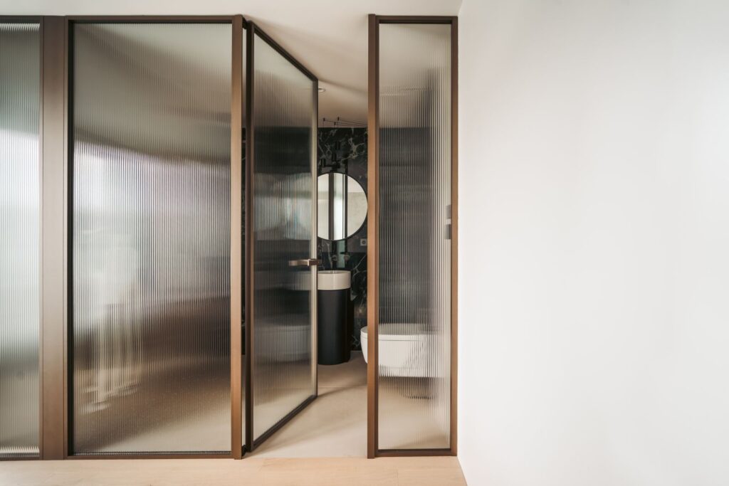 Na obytnou část navazují klidnější segmenty bytu — pracovna, ložnice se šatnou a koupelna, které jsou částečně propojeny prosklenými stěnami umožňujícími průnik denního světla do hloubky dispozice. Na terasu přiléhá relaxační zóna se saunou a vířivkou, přístupná z technického zázemí bytu.
