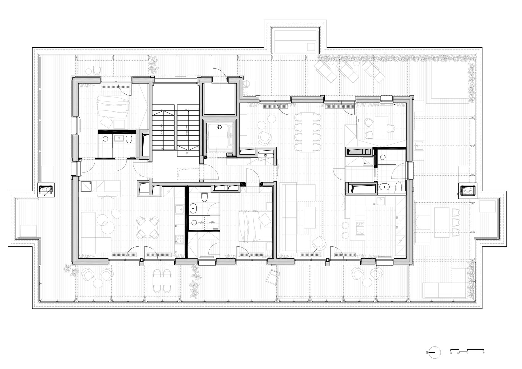 Oba byty zaujímají nejvyšší podlaží bytového domu v pražských Holešovicích a po jejich obvodu se rozvíjí společná střešní terasa, opticky rozdělená tak, aby každá jednotka měla vlastní soukromou část. Architekti převzali prostor ve stavu shell and core a navrhli nové dispoziční řešení včetně všech příček, instalačních rozvodů i vestavěného vybavení.