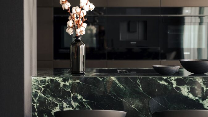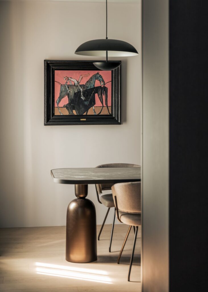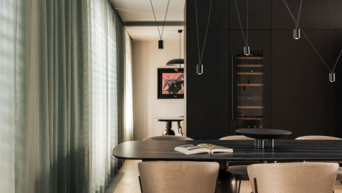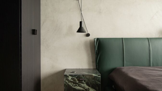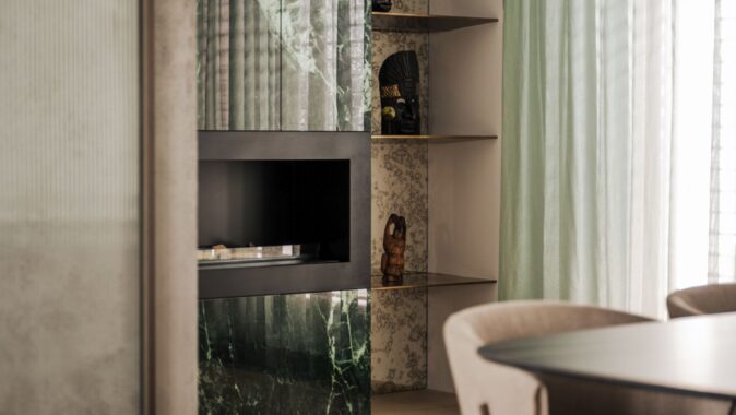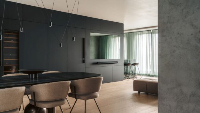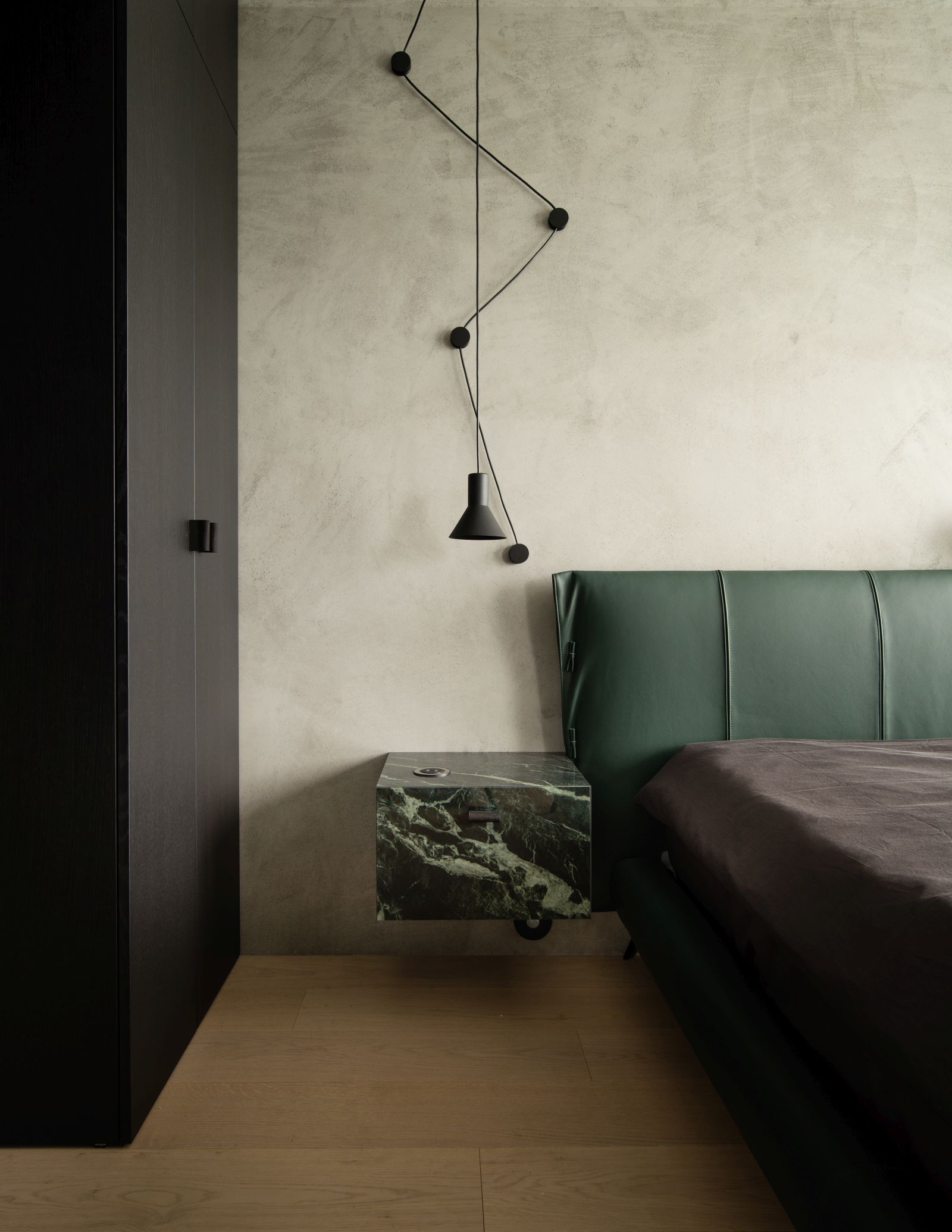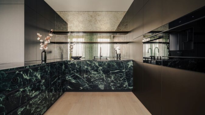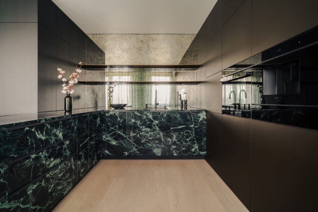 Větší z bytů je koncipován jako hlavní rezidence majitele. Interiér pracuje s tmavšími materiály a kontrastní barevností, kterou sjednocuje výrazný motiv zeleného mramoru. Ten se objevuje v kuchyni, koupelně i na vybraných nábytkových prvcích a stává se hlavním vizuálním akcentem prostoru. Dispozice navazuje na vstupní halu, z níž se přes prosklené příčky otevírá hlavní obytný prostor propojující obývací část, jídelnu a kuchyň. Centrálním prvkem je truhlářský objem oddělující jednotlivé funkční zóny a integrující technické i úložné prostory.