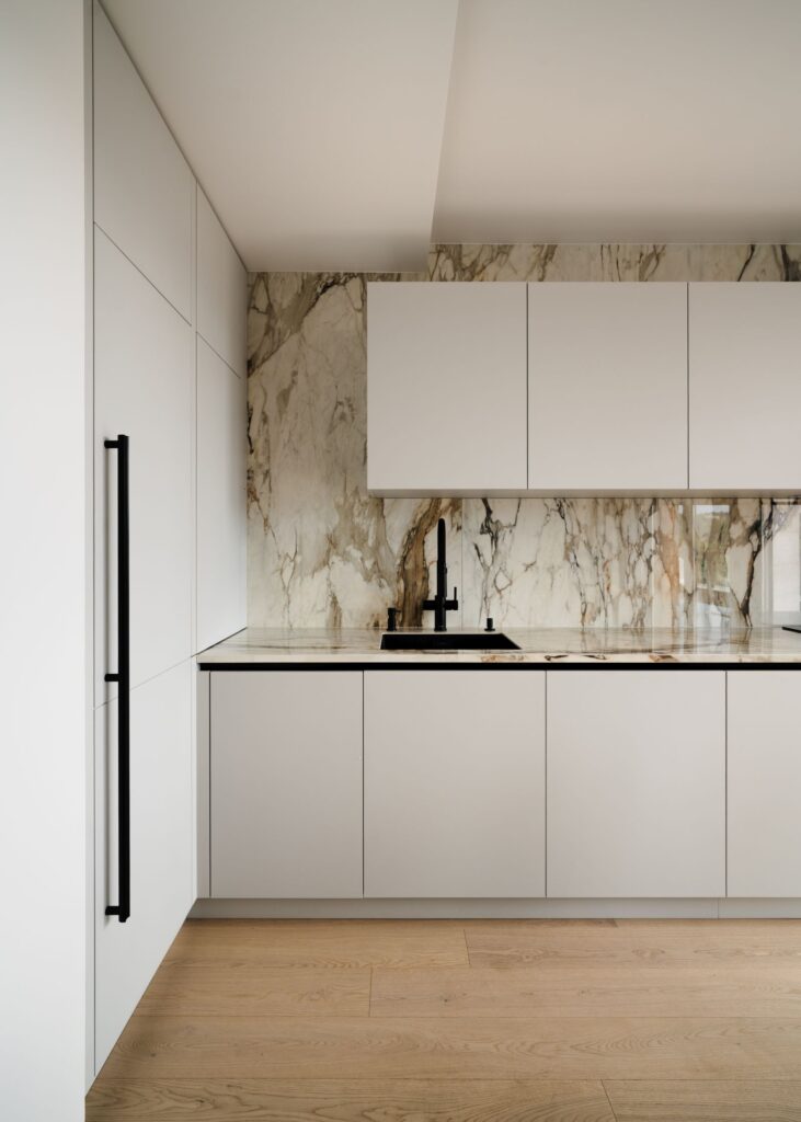 Menší byt určený pro druhého z bratrů vychází ze stejného prostorového principu, avšak v odlišné materiálové interpretaci. Interiér je laděn do světlých přírodních tónů a působí klidnějším, civilnějším dojmem. Denní část tvoří otevřený obytný prostor s kuchyní a jídelním koutem, na který navazuje ložnice a kompaktní koupelna. Také zde se objevuje mramor jako sjednocující materiál, tentokrát ve světlé béžové variantě odpovídající celkovému charakteru bytu. Z obytných místností je přímý vstup na střešní terasu.