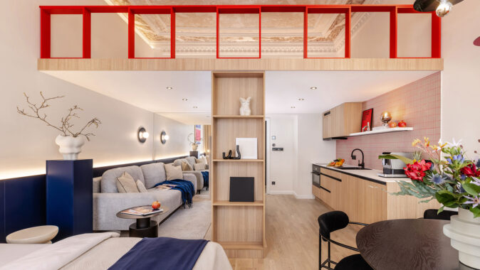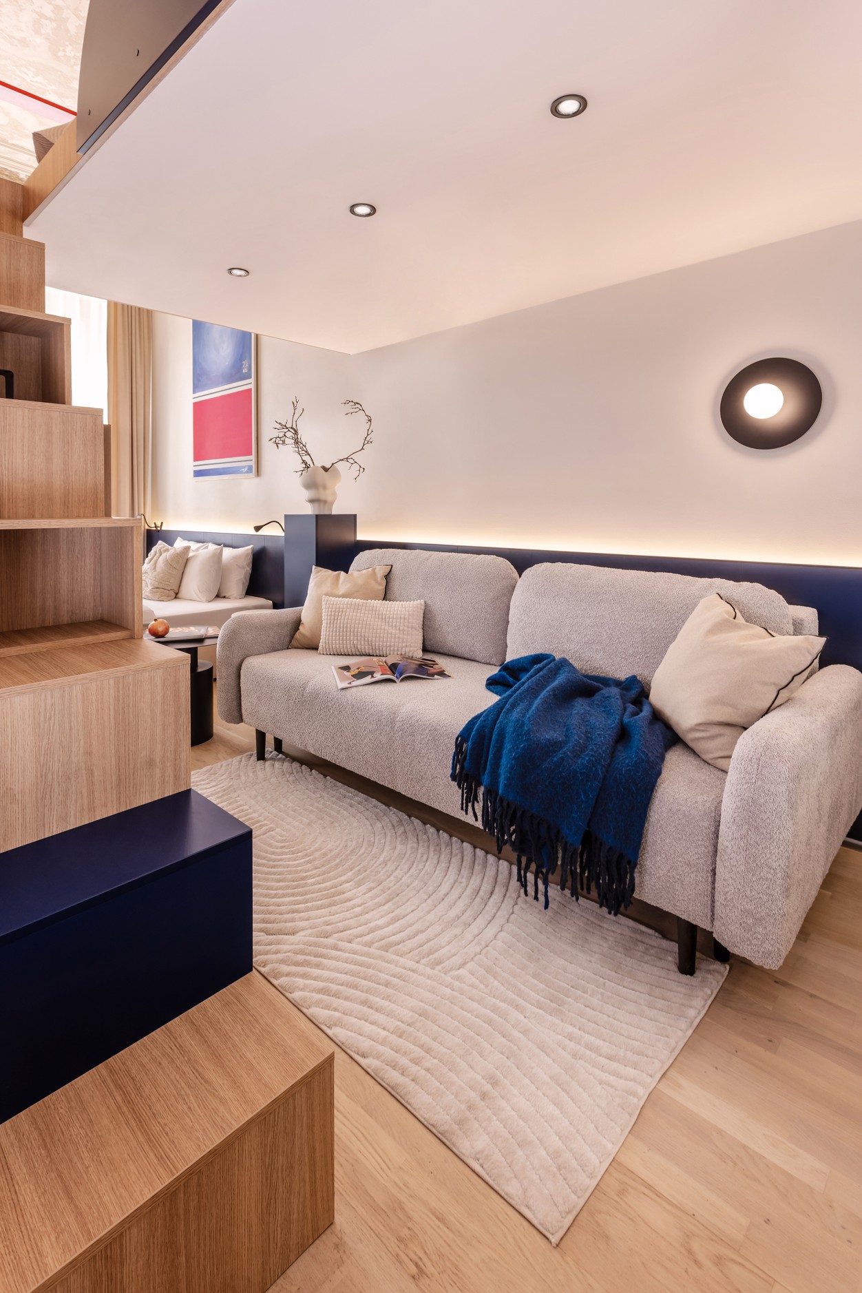 Hlavní místnost o velikosti 28 m² je rozdělena do dvou části, přičemž určující prvek představuje výška stropu 3,75 metru. Prostor pod tímto vysokým stropem je rozdělen na dvě zóny. V první části, pod vloženým patrem, se nachází kuchyně a TV kout s pohodlným gaučem, což vytváří útulné místo pro relaxaci. Tato část je koncipována tak, aby byla funkční a praktická – schodiště, které vede do patra, zároveň plní funkci nábytkové stěny a ukrývá spotřebiče, jako je lednice, a tak šetří místo a přispívá k celkové organizaci prostoru.