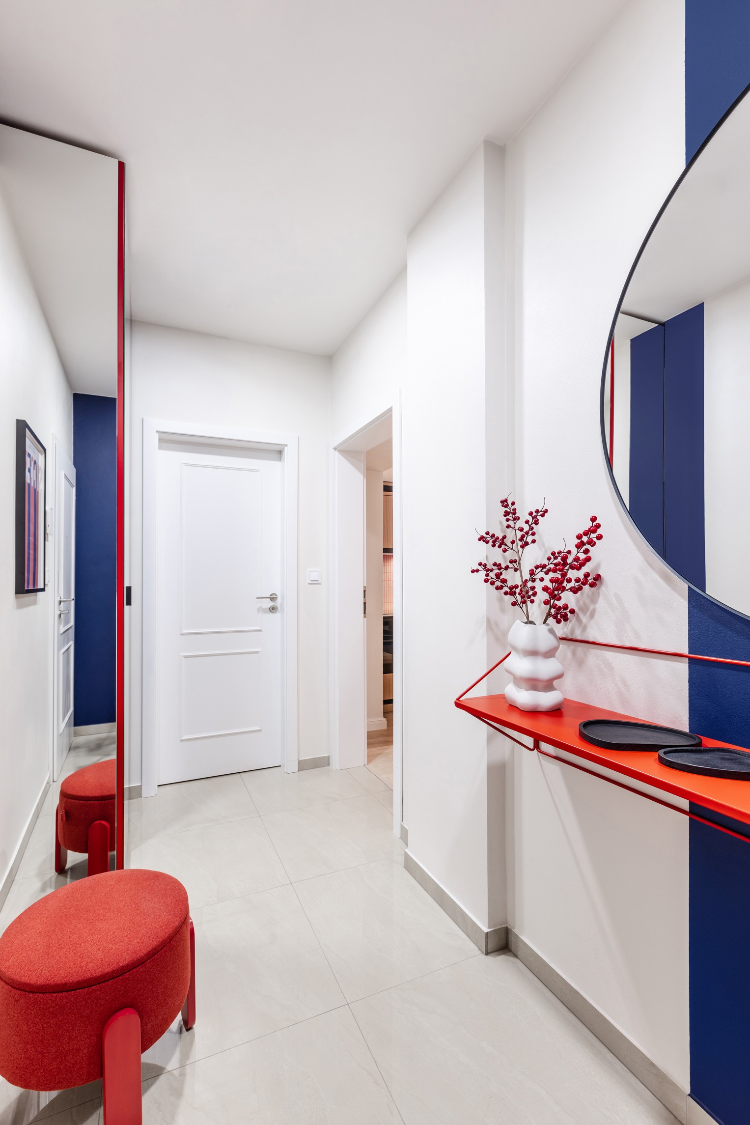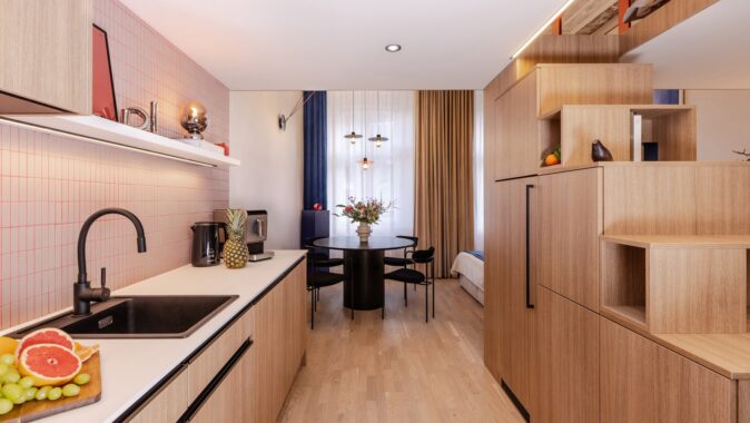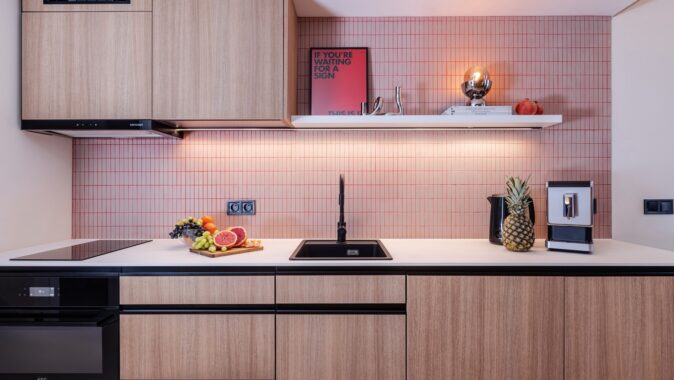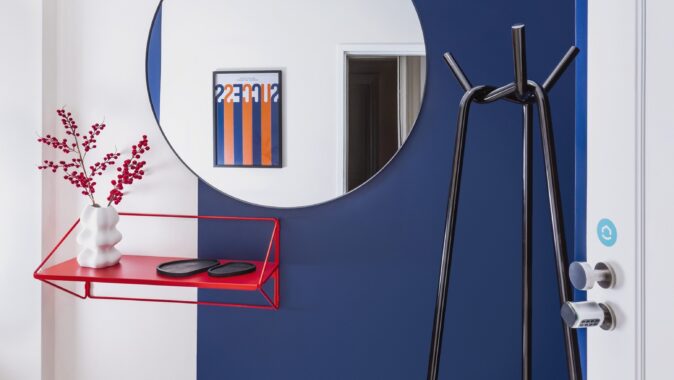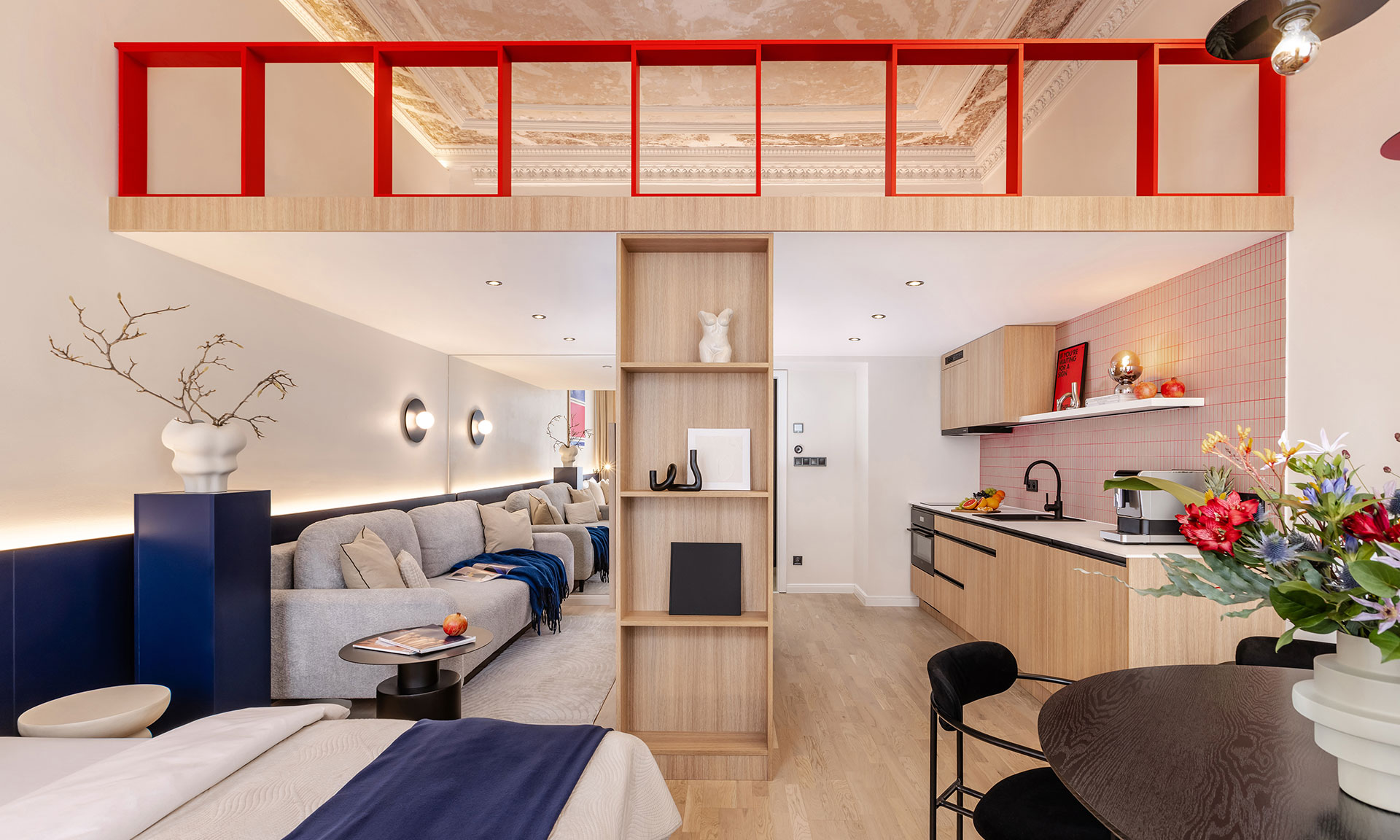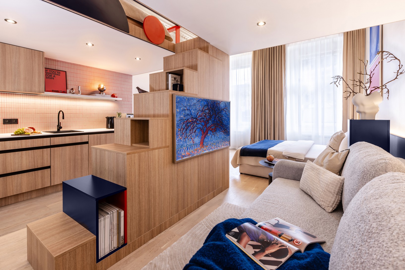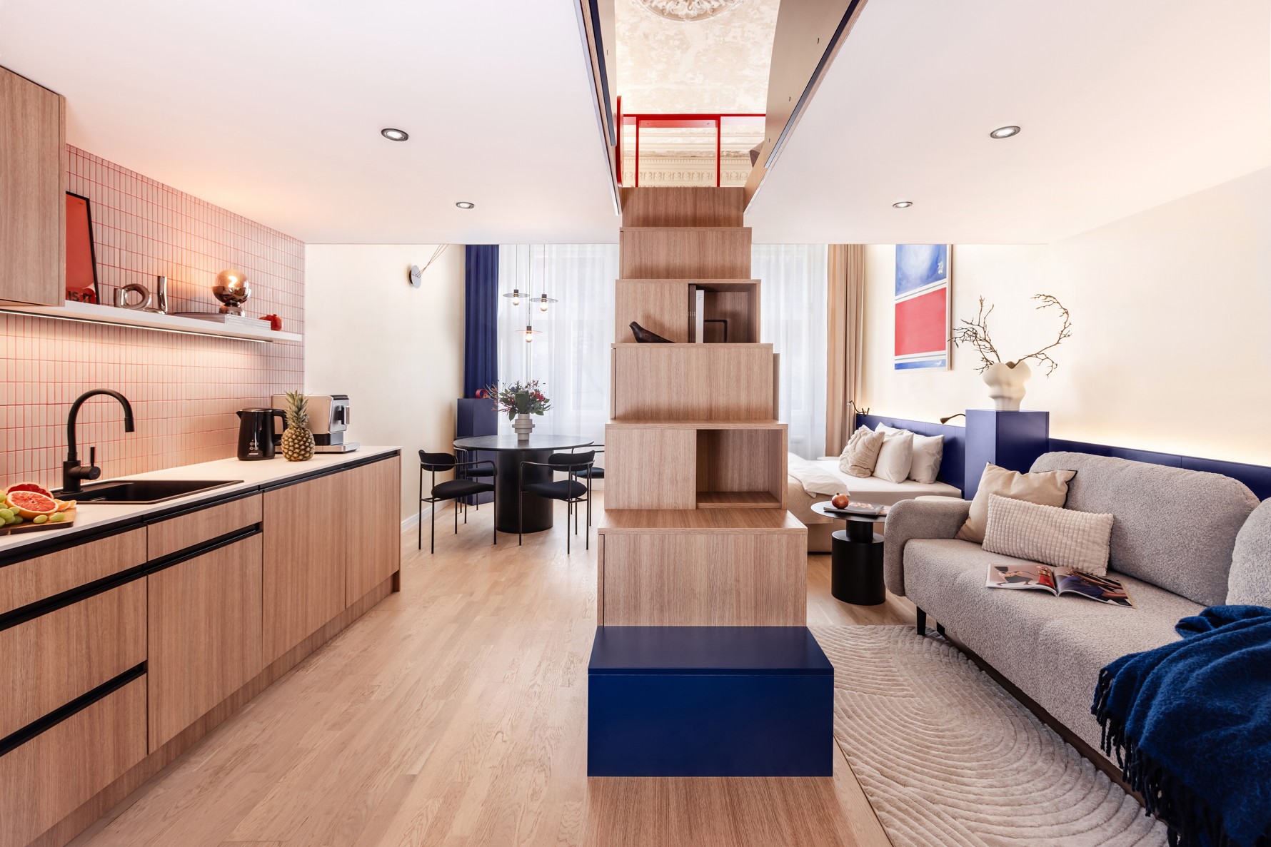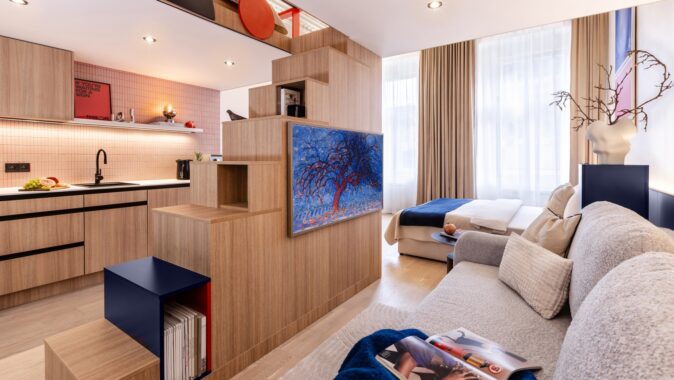 Důmyslné využití prostoru a neotřelý design sází na eleganci a funkčnost. Nábytek byl navržen a vyroben na míru, aby co nejlépe vyhovoval specifickým potřebám prostoru. K tomu byly použity materiály v dřevo-dekoru s akcenty výrazných barev, jako je modrá a chilli červená, které přinášejí do interiéru energii a živost. Tento design nejenže splňuje požadavky na praktické využití, ale zároveň dokáže nabídnout moderní a příjemné prostředí pro každodenní život.