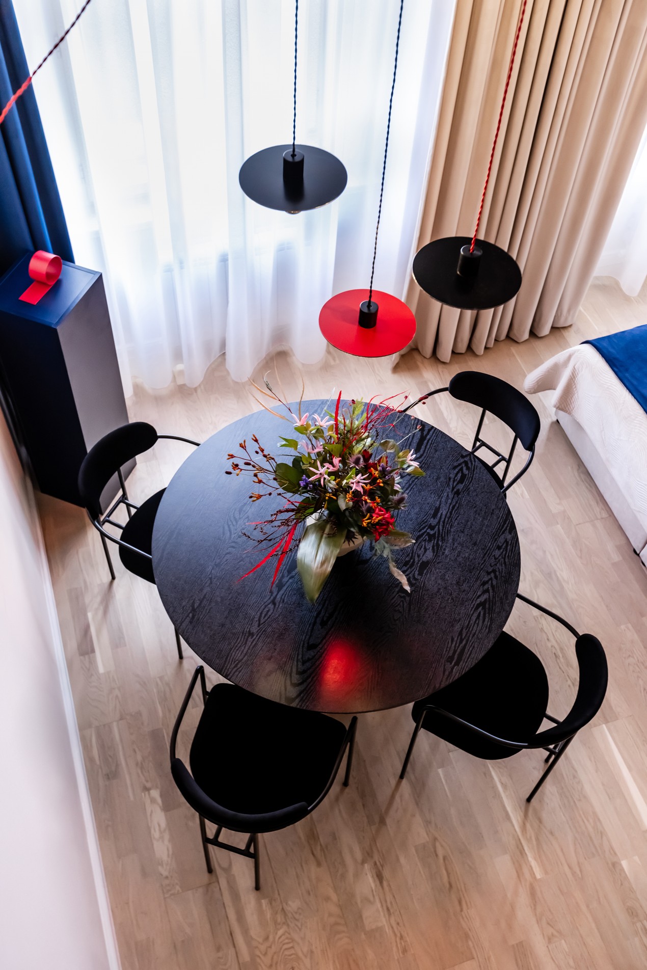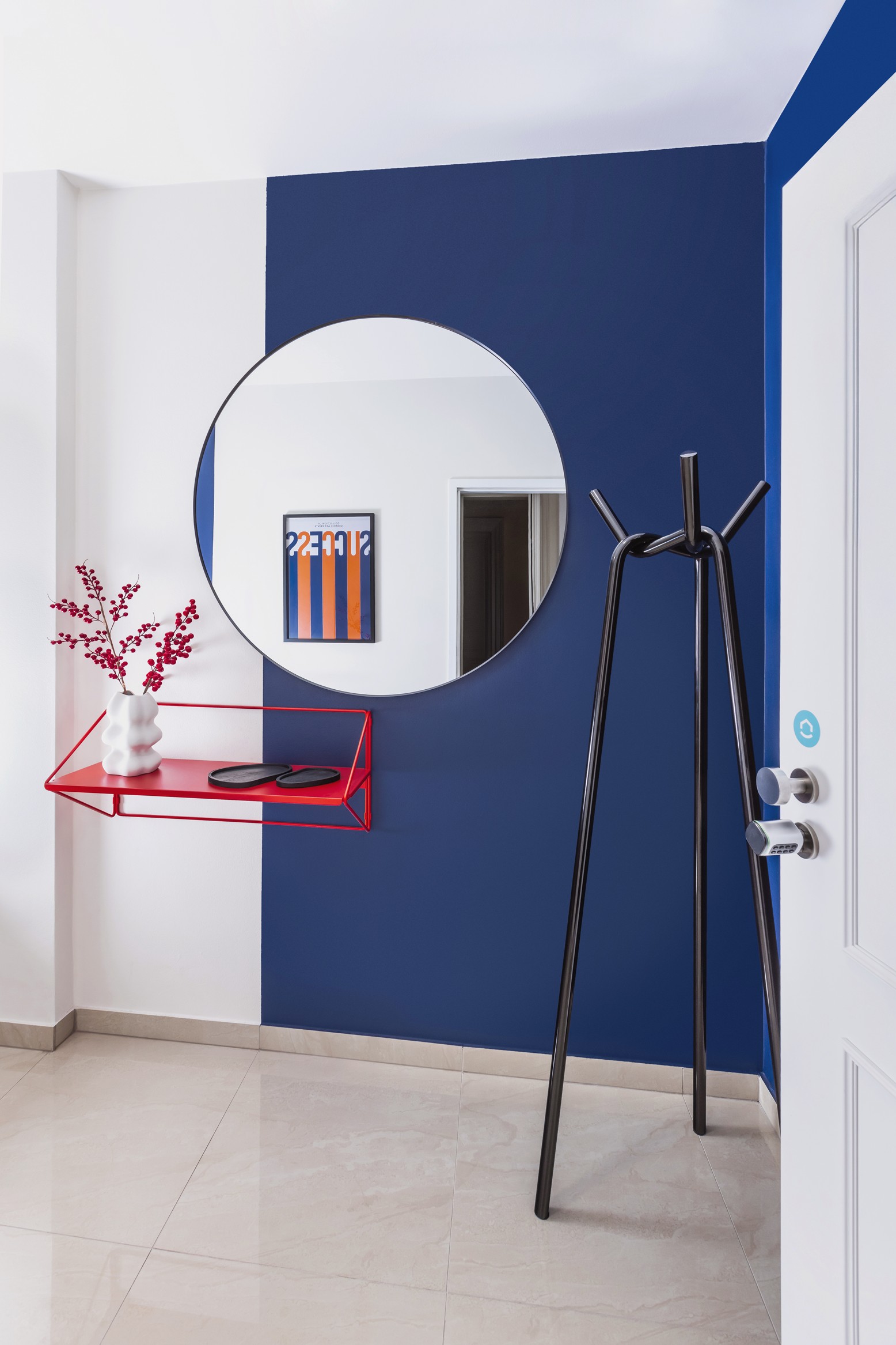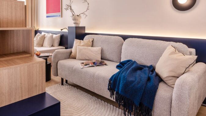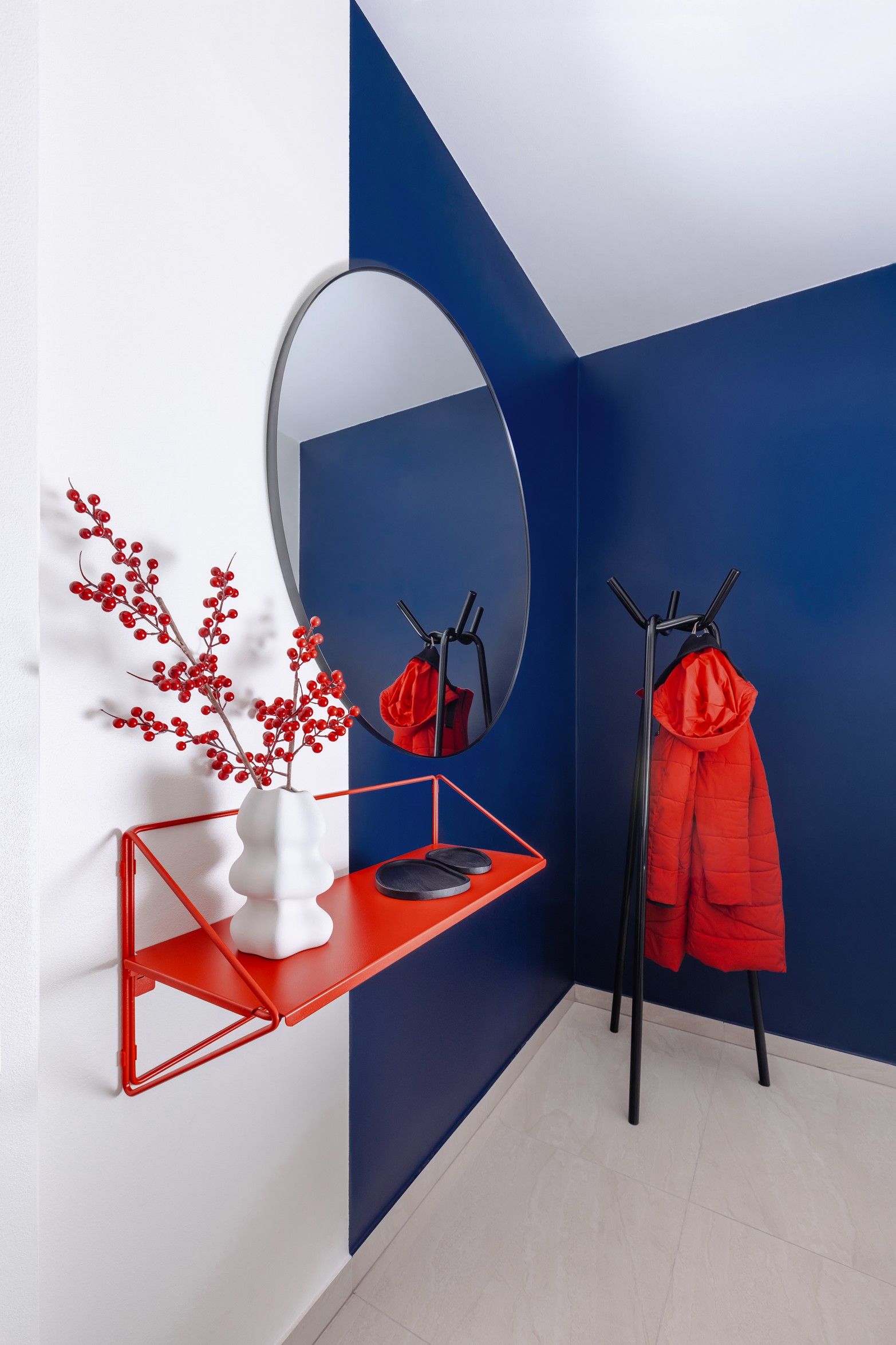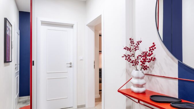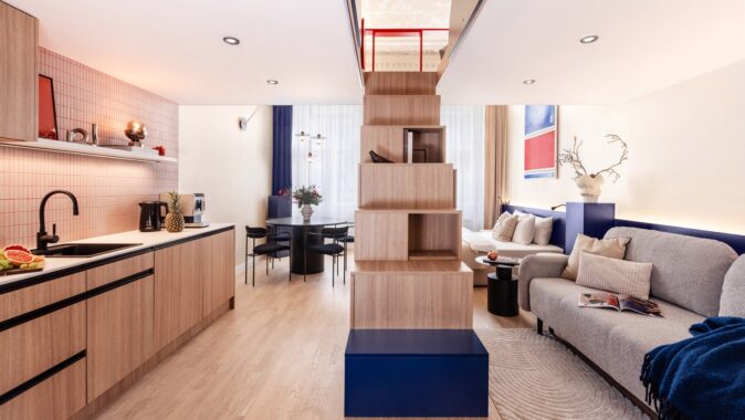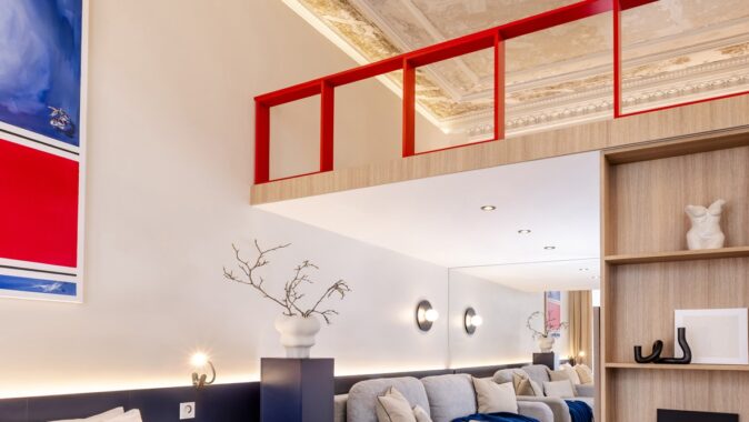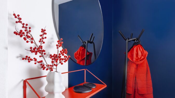 Důmyslné využití prostoru a neotřelý design sází na eleganci a funkčnost. Nábytek byl navržen a vyroben na míru, aby co nejlépe vyhovoval specifickým potřebám prostoru. K tomu byly použity materiály v dřevo-dekoru s akcenty výrazných barev, jako je modrá a chilli červená, které přinášejí do interiéru energii a živost. Tento design nejenže splňuje požadavky na praktické využití, ale zároveň dokáže nabídnout moderní a příjemné prostředí pro každodenní život.