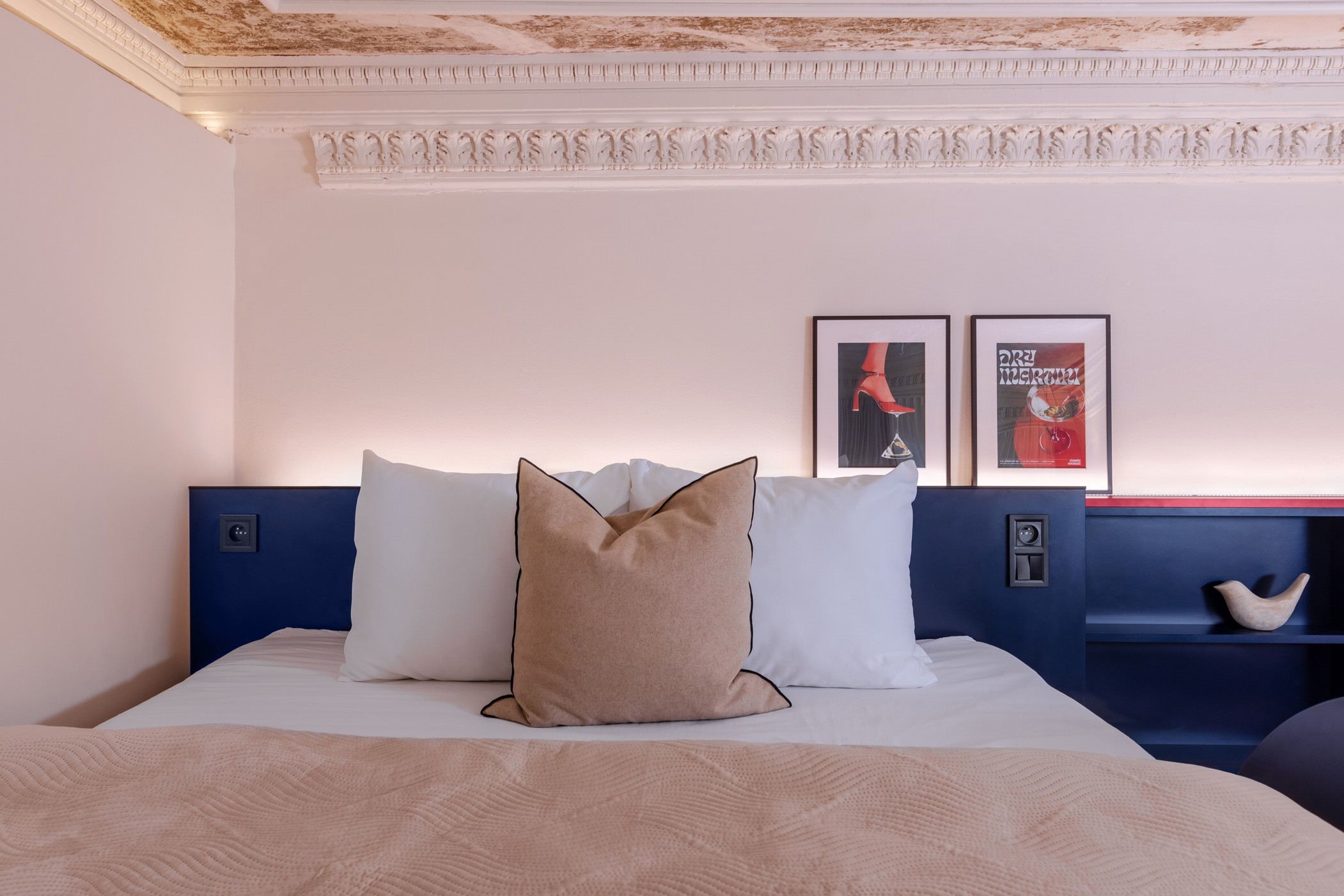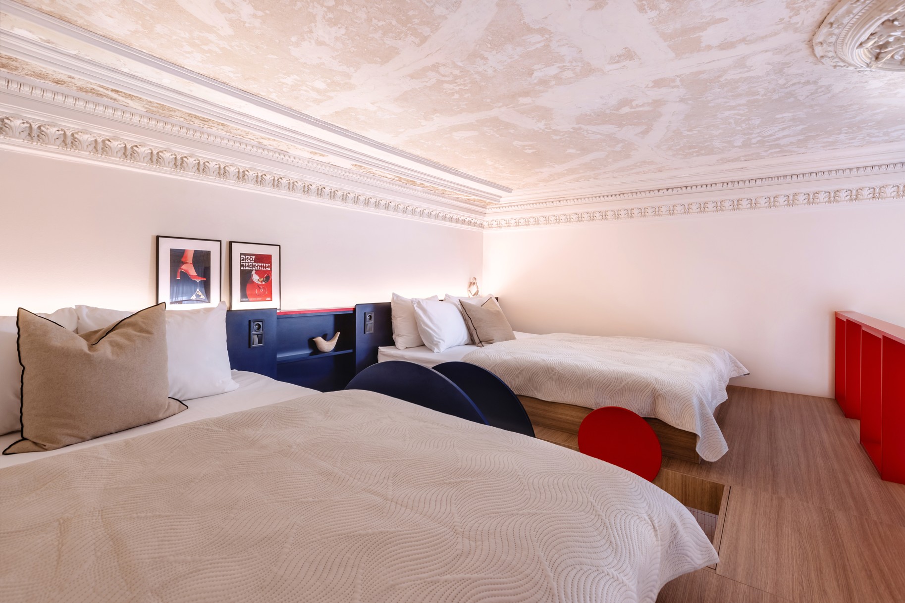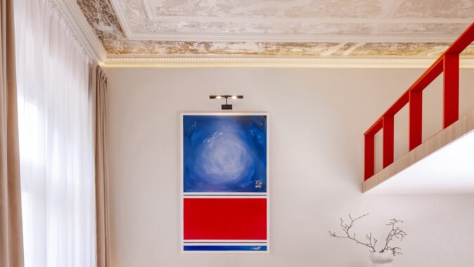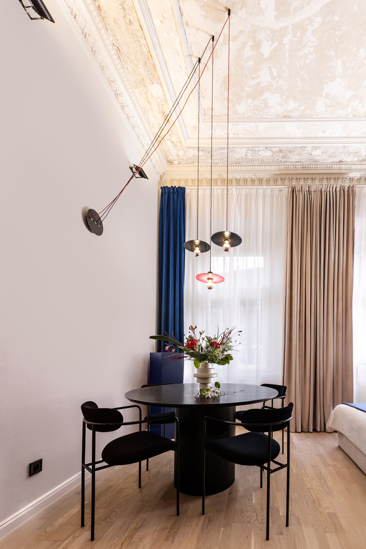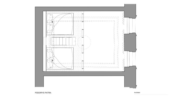 Po výmalbě štuků se barva bohužel oloupala, i proto bylo nakonec rozhodnuto ponechat strop ve velmi surovém stavu a ukázat všechny vrstvy historie. Tento přístup vytváří v prostoru jedinečnou atmosféru.