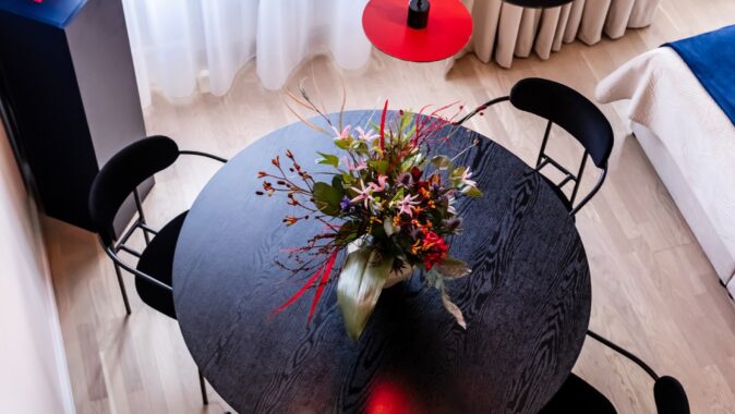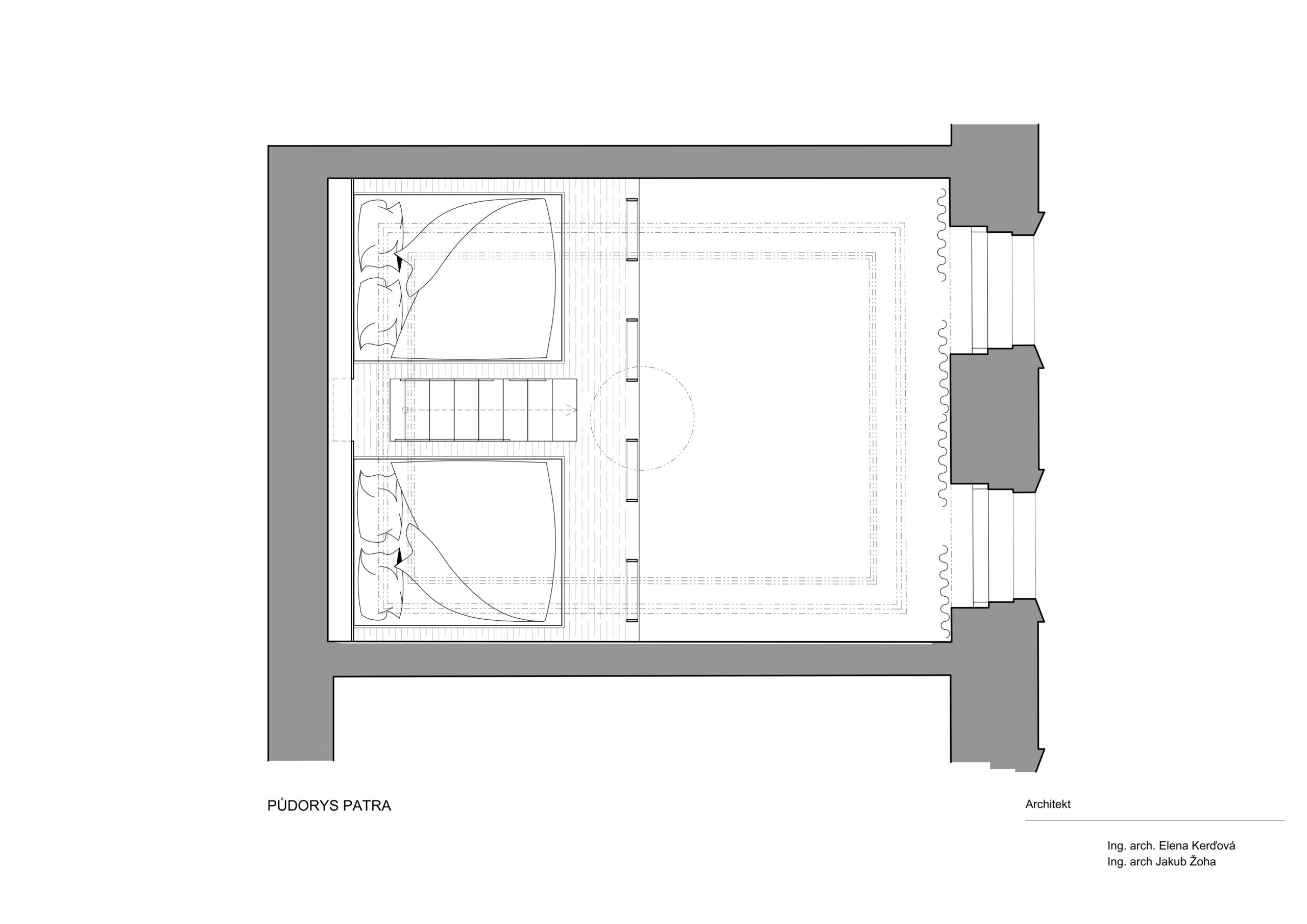 Druhá část místnosti, která není rozdělena patrem, nabízí pocit vzdušnosti a otevřenosti. Je to místo pro jídelní stůl a nyní i pro postel. Zadavatel klade důraz na to, aby garsonka nabízela kapacitu pro spaní, a zároveň byla koncipována tak, že lze prostor přetvořit pro plnohodnotné bydlení. Po přemístění postele by spodní část mohla sloužit jako obytný prostor s kuchyní, zatímco v patře by byl vytvořen prostor pro spaní a třeba pracovnu.